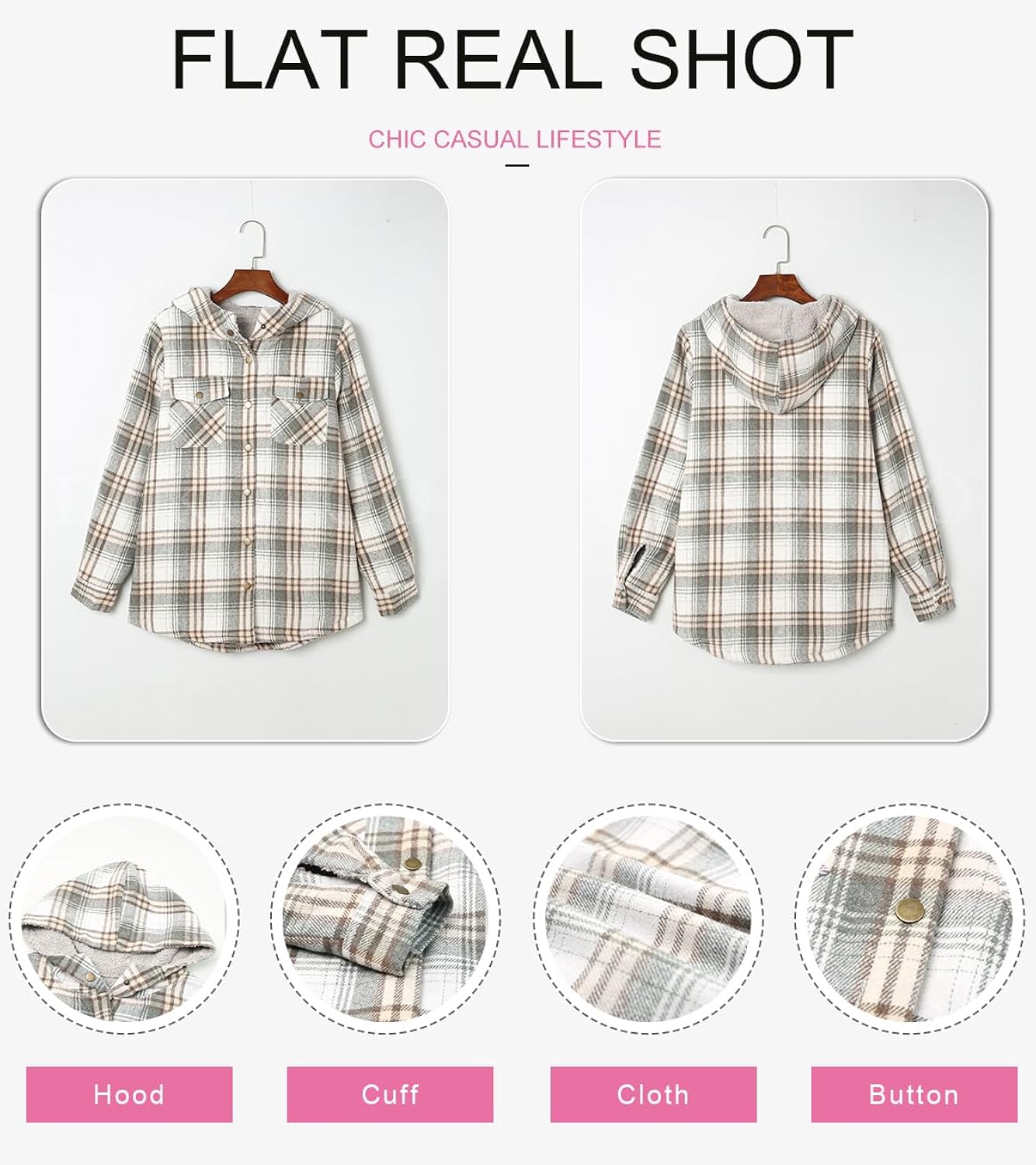 Feature: Fleece Lined, Plaid Pattern, Hooded Design, Front Button Closures, Long Sleeve with Button Cuffs, Boyfriend Style, Loose Fit Jackets