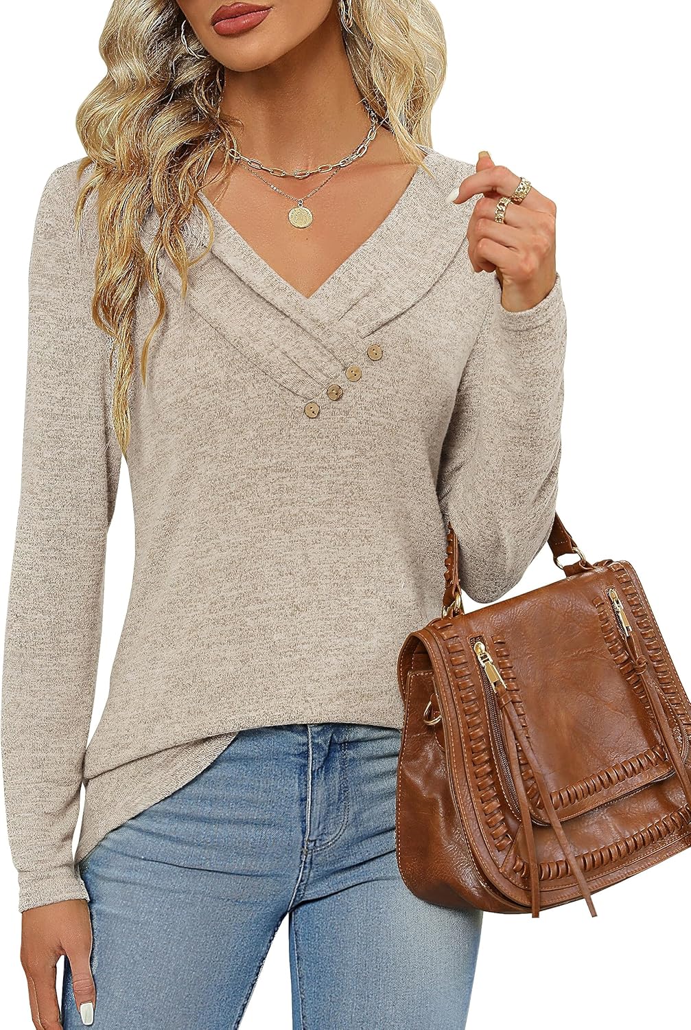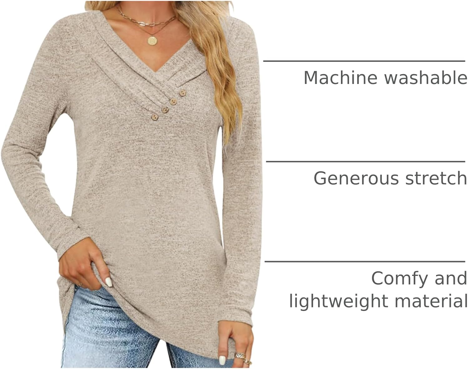 Features: Elegant v neck fall sweater ,long sleeve shirts, decorative buttons, basic solid color, business sweatshirt makes you flattering in this fall and winter.