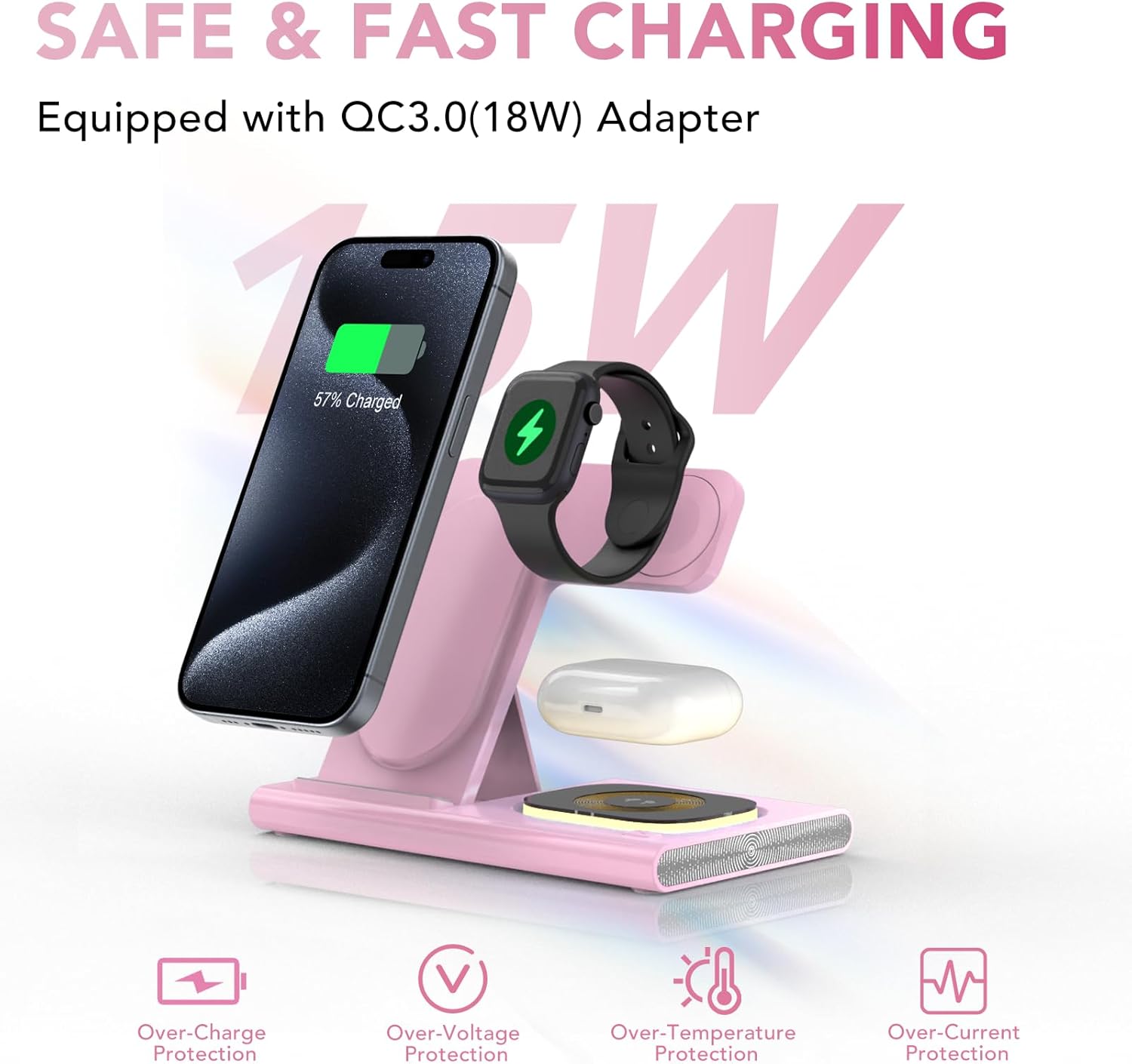 [What You'll Get] 1* 3 IN 1 Wireless Charging Station,1*Charging Cable(3.7ft),1*18W QC3.0 Wall Adapter(9V/2A)(Please must use 18W adapter or above for faster charging speed),1*Product manual(Please read it before use). Every product we sent to you has gone through a series of quality inspection processes. If you find any omissions or defects in the packaging, we can provide a solution.