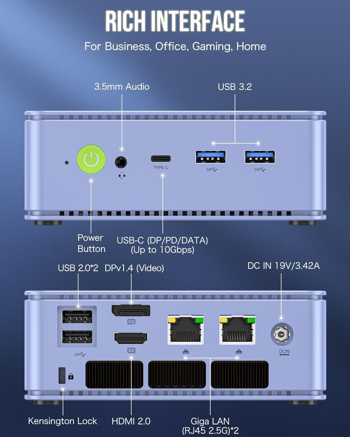 Fast Internet WiFi 6E + BT5.2 Connection - GMKtec Mini PC with WiFi-6E Wireless, have 2.5G/5G/6G triple band, more faster and lower latency. Bluetooth 5.2 allowing you more quickly to connect other wireless devices (headset, mouse, keyboard, etc.) Interface features 2*USB3.2 ports, 2*USB2.0 ports, 1*HDMI 2.0 port(4K@60Hz), 1*USB-C port(PD/DP/DATA), 1*DP Port, 1*Audio 3.5mm (HP&MIC), 1*DC Power Port.