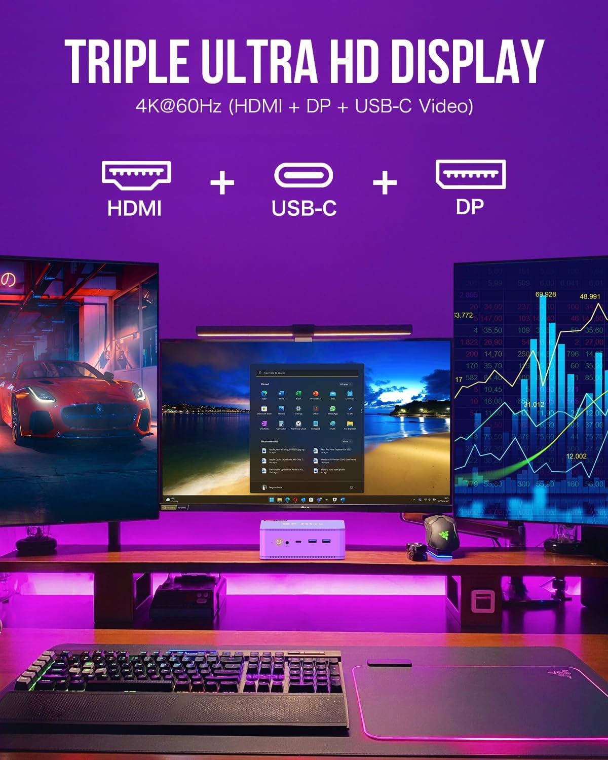 Mini Desktop Computer with 4K Triple Screen Display - Nucbox M5 Plus integrates AMD Radeon Graphics 8 Cores 2000 MHz GPU to deliver powerful graphics processing power to easily handle the demands of complex design software, 4K@60Hz UHD video editing, and playback, or mid-range gaming. And it can connect to 3 display screens simultaneously.
