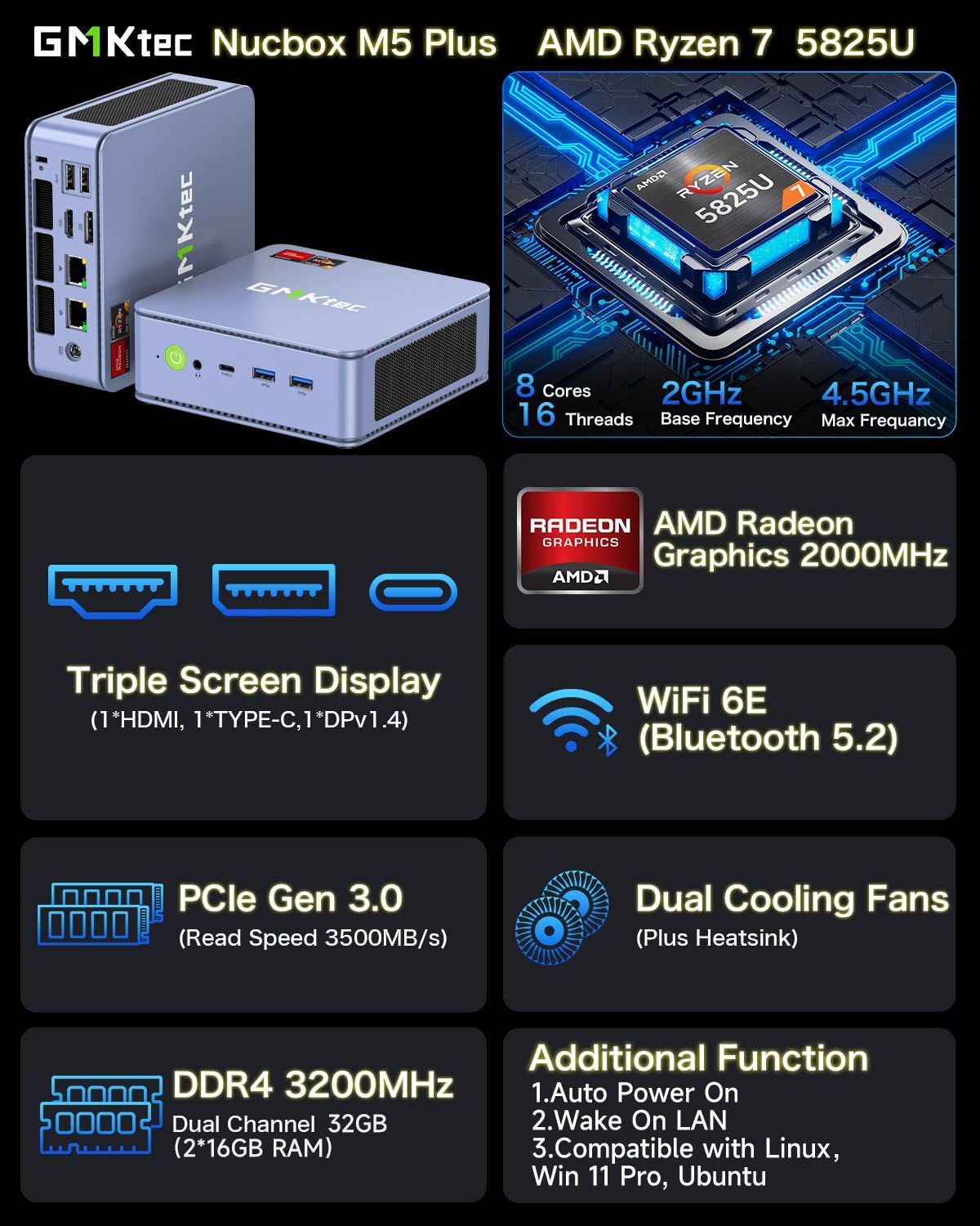GMKtec M5 Plus Gaming Mini PC Ryzen 7 5825U (Upgraded 5700U), 32GB RAM 1TB SSD Dual NIC LAN 2.5GbE Desktop Computers, Trip...