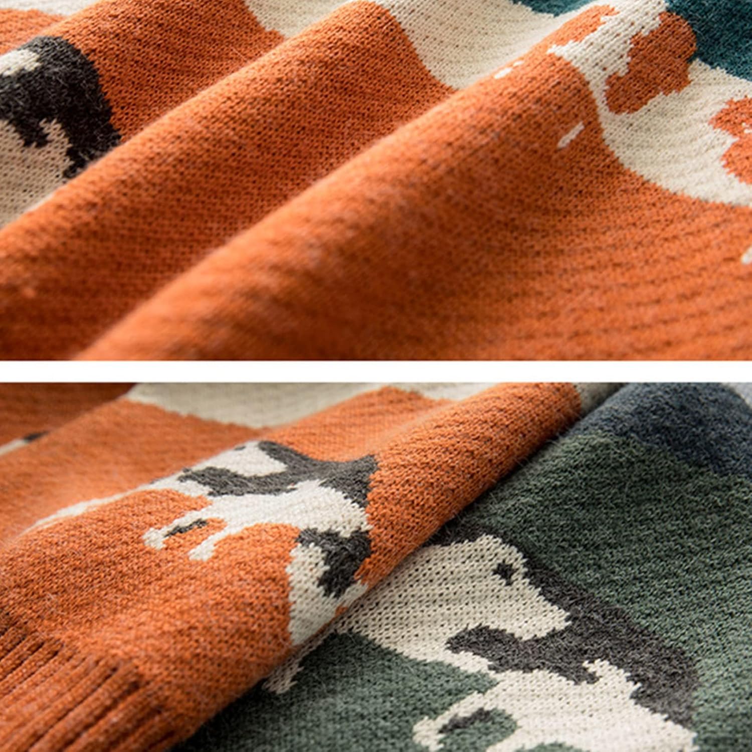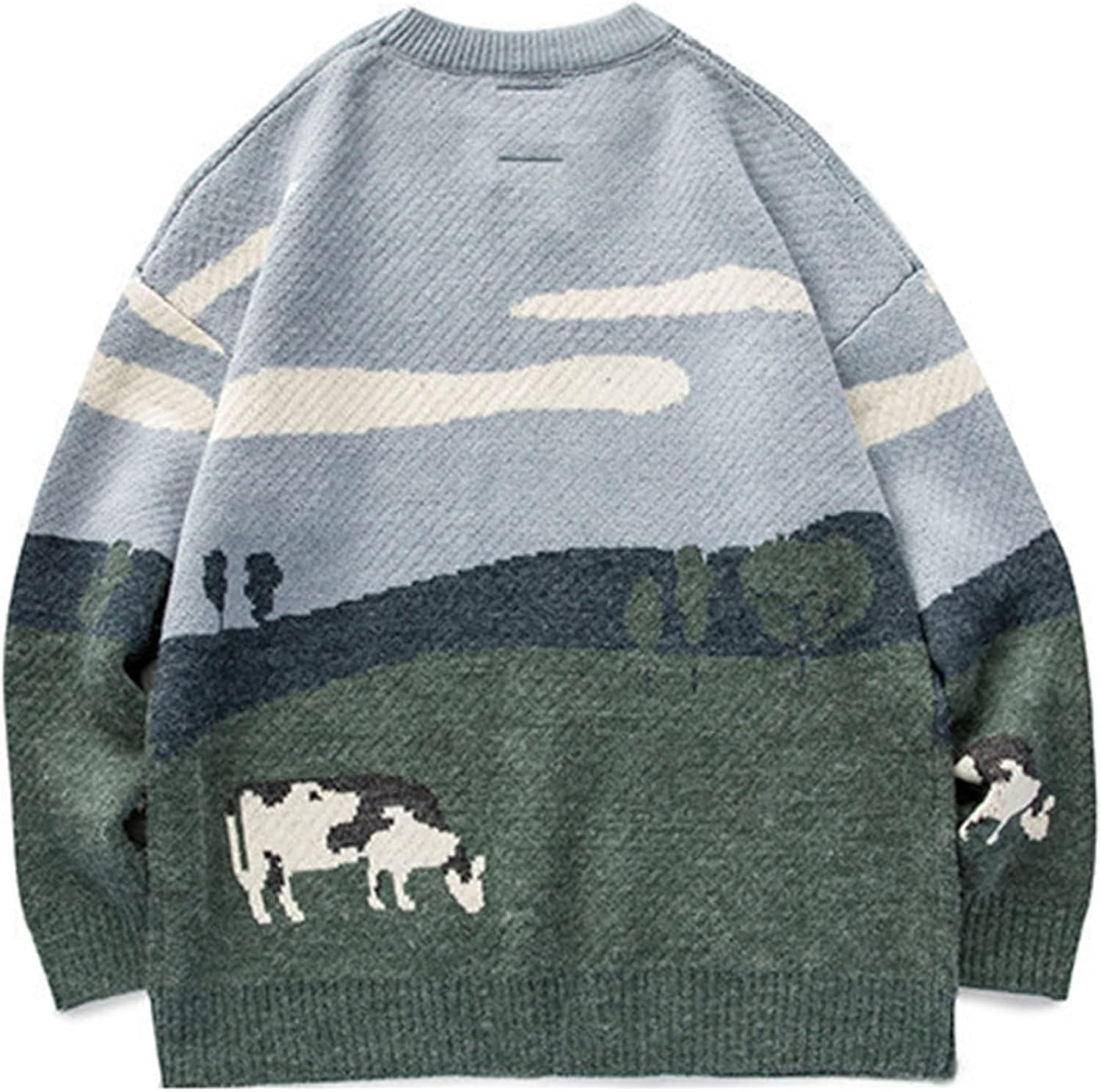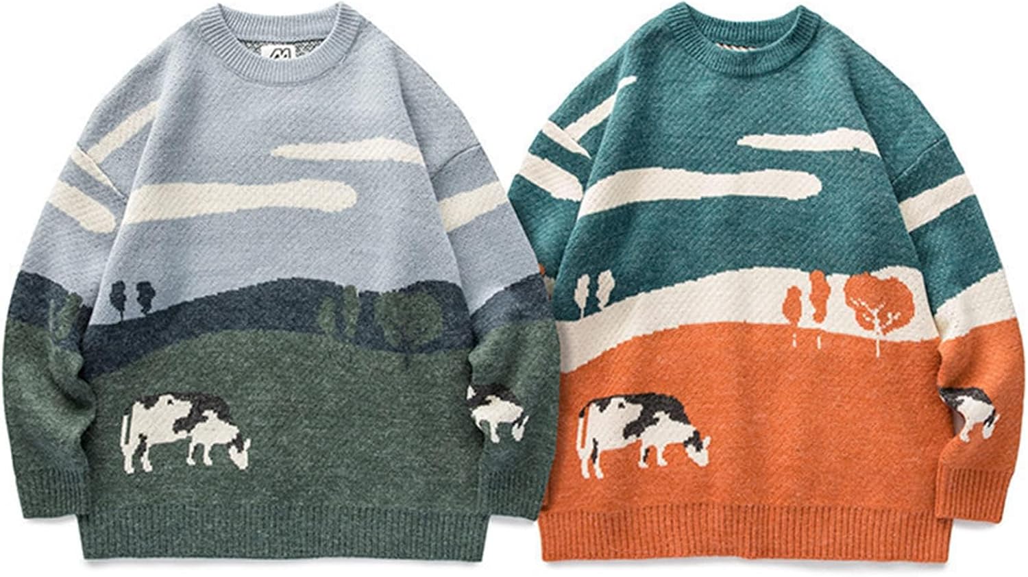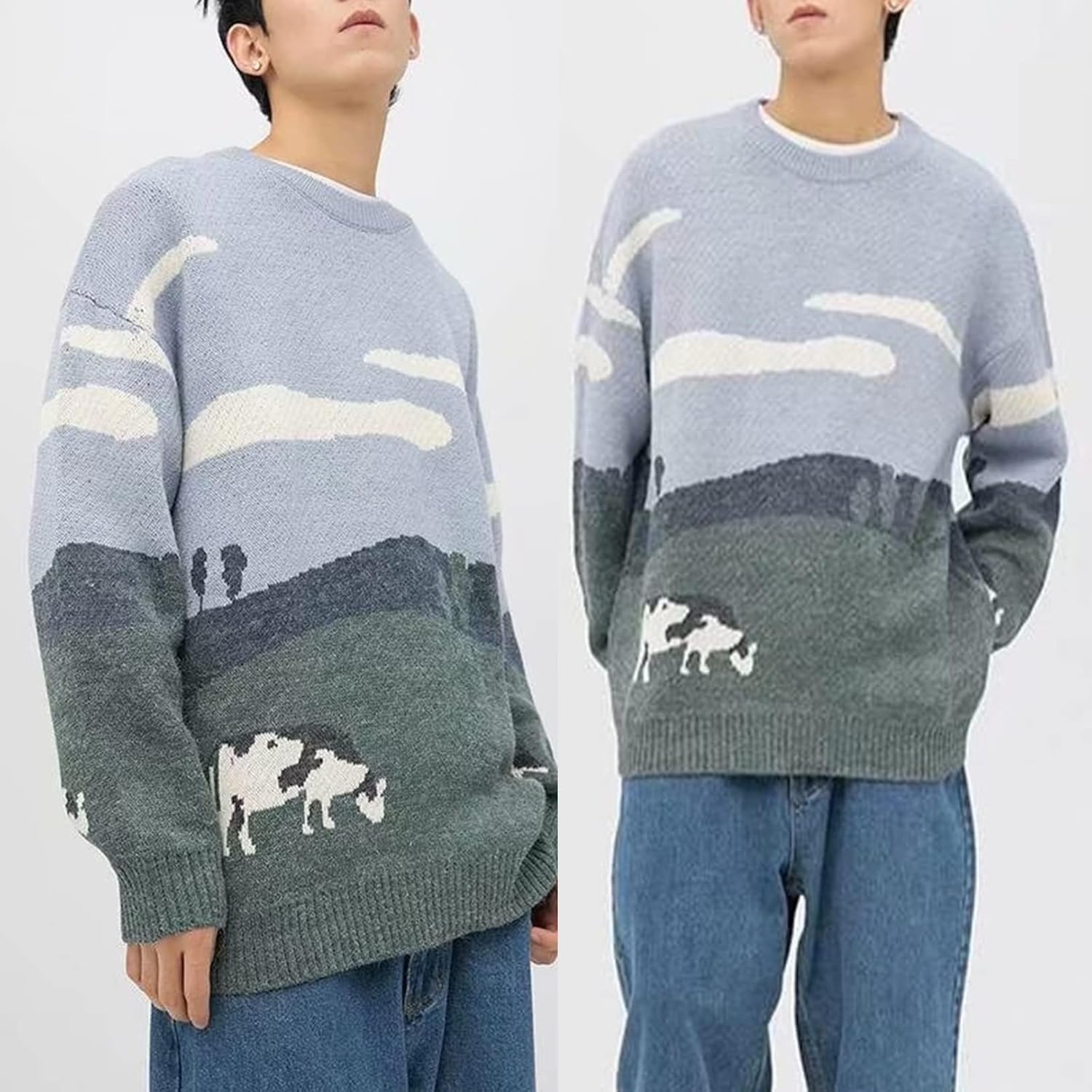 【Features】Mens vintage oversized knitted sweater, cute unique graphic printed, cow print sweater, vintage design and crewneck style add a touch of retro charm to any outfit, oversized fit shows a relaxed and effortless vibe