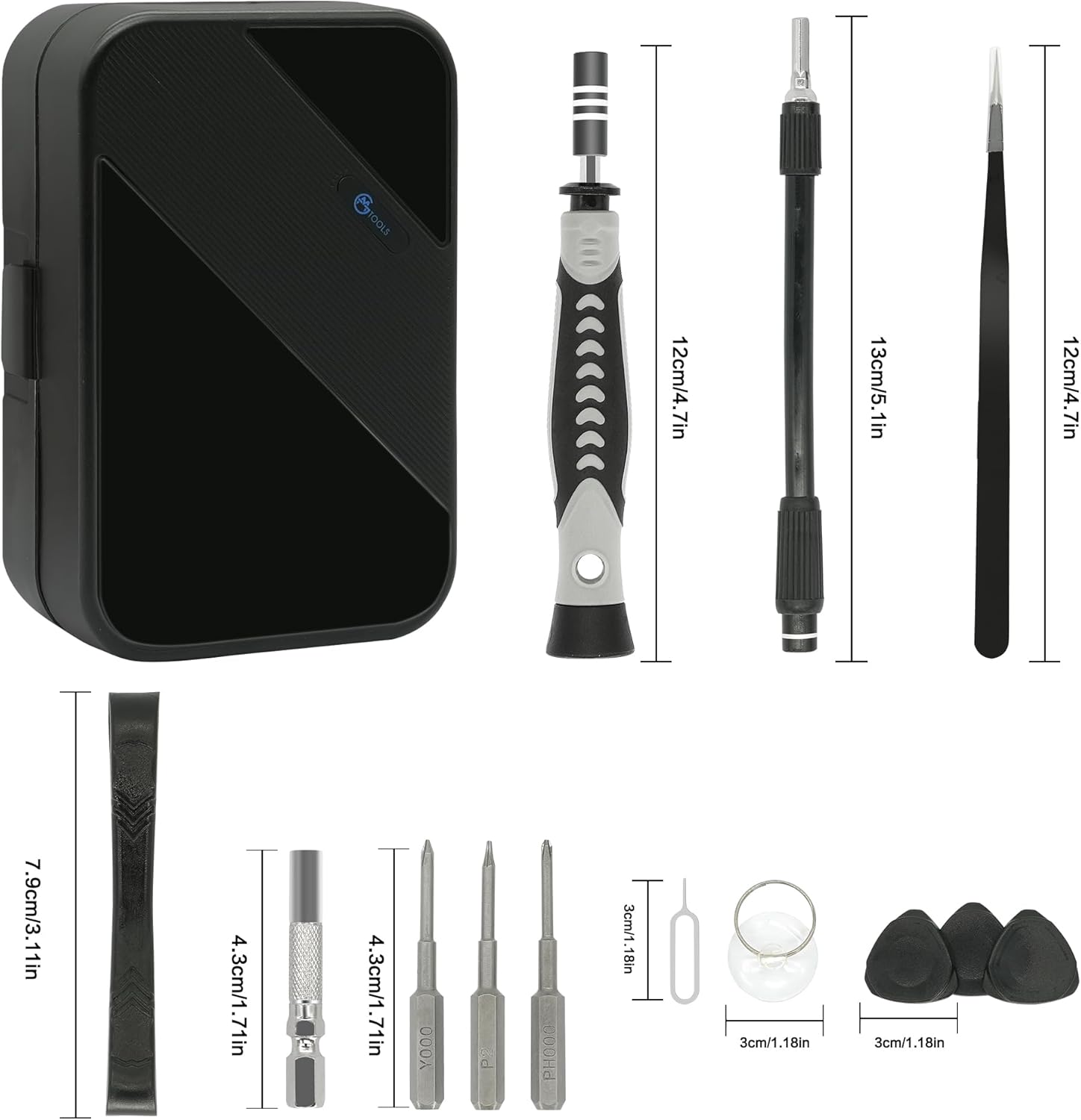 APPROPRIATE SCREWDRIVER SET: This set includes 117 Pcs High-quality Precision bits set(torx bit, hex bit, nut drivers, star screwdriver bit, tri-wing bit, torx security), 3xOpening picks, Suction cup, SIM card removal tool, 3 pcs 4.0*35mm Phillips bits and slotted bits, adjustable screwdriver handle, soft extension shaft, precision tweezers, opening tool kit.