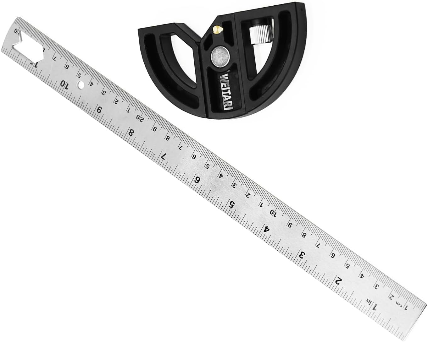 This miter saw protractor has the function of a ruler and a corner measuring tool. Rotating to the scales to 180°, the angle finder tool can be used as a ruler of 200mm and 12 inch.