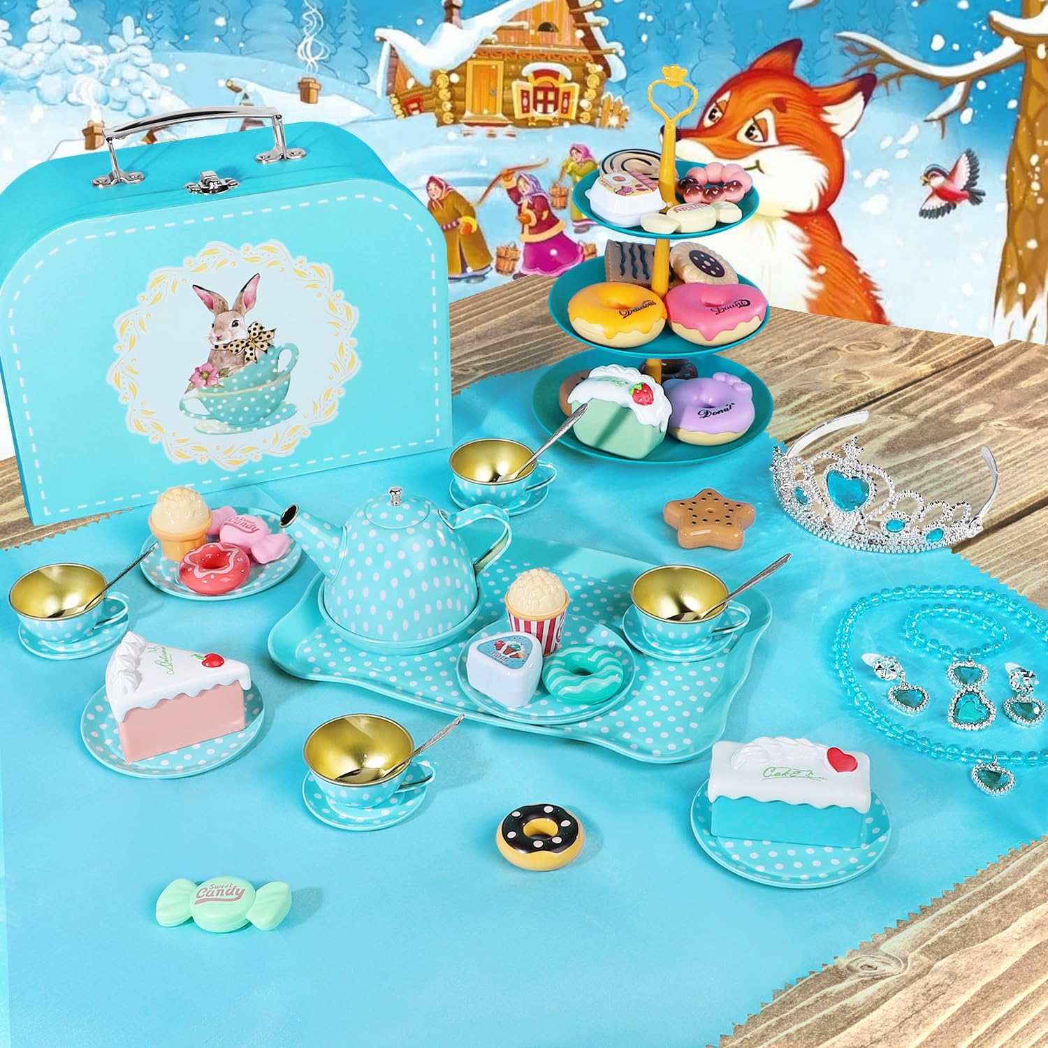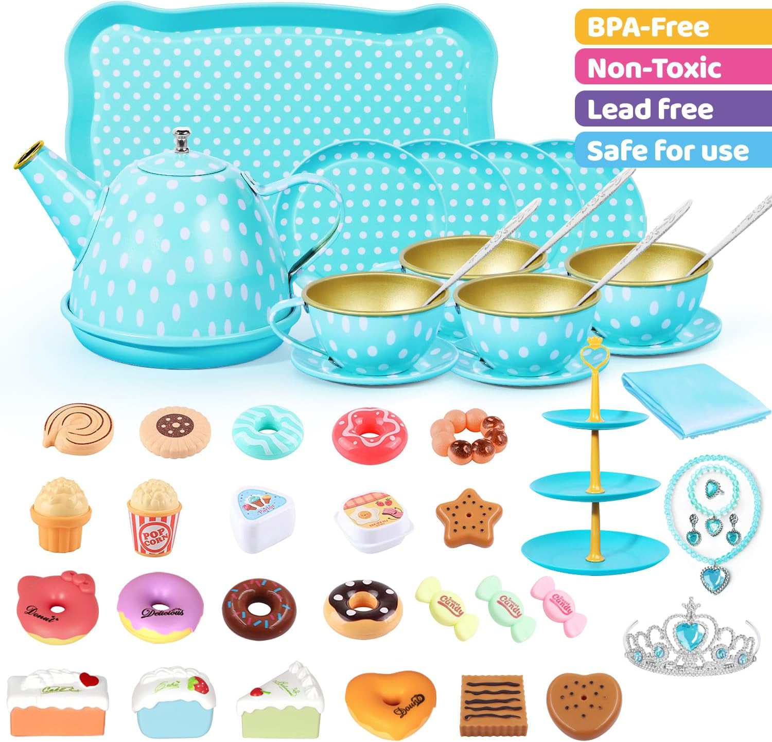 ??【PERFECT TEA SET FOR LITTLE HAND】This adorable kids tea set is designed for pretend play, includes 1 teapot, 1 serving tray, 4 cups, 4 spoon, 4 saucers, 4 plates, 1 crowns, 1 necklace, 1 bracelet, 1 rings, 1 pair earrings, 1 3-tiered cake stand, 1 tablecloth, 1 cardboard carrying case, 23pcs ABS Plastic pretend to play dessert with a variety of donuts, macaron, salad dressings, popcorn etc.