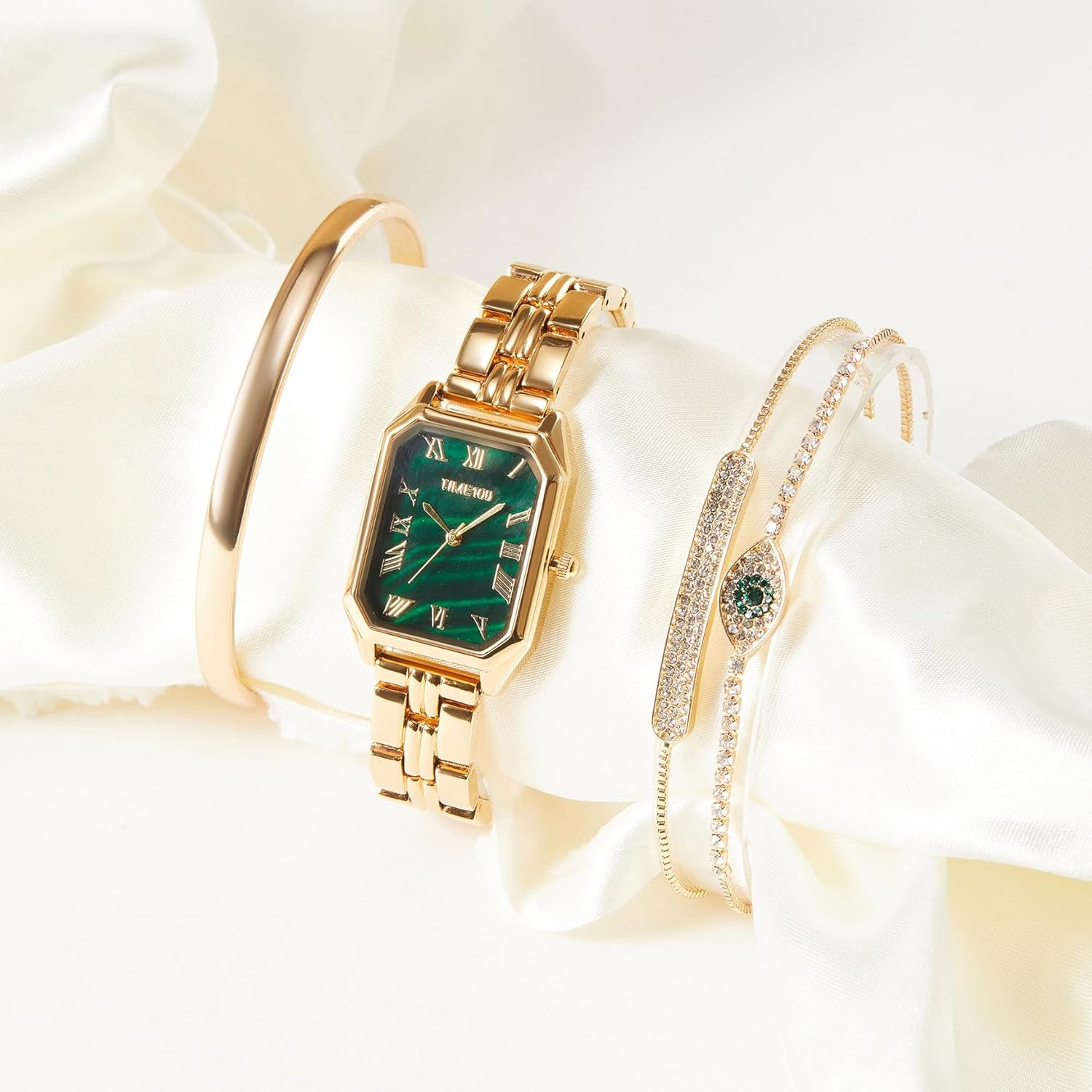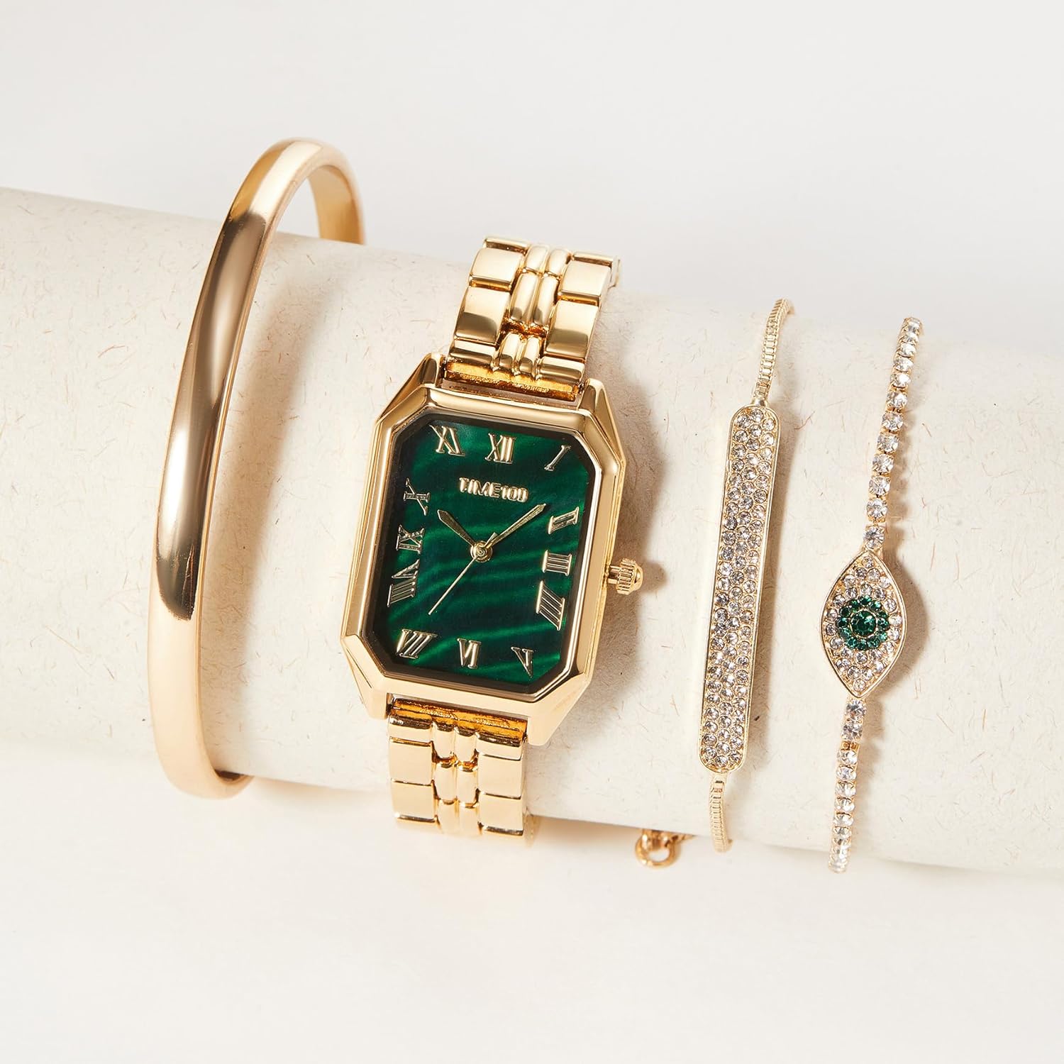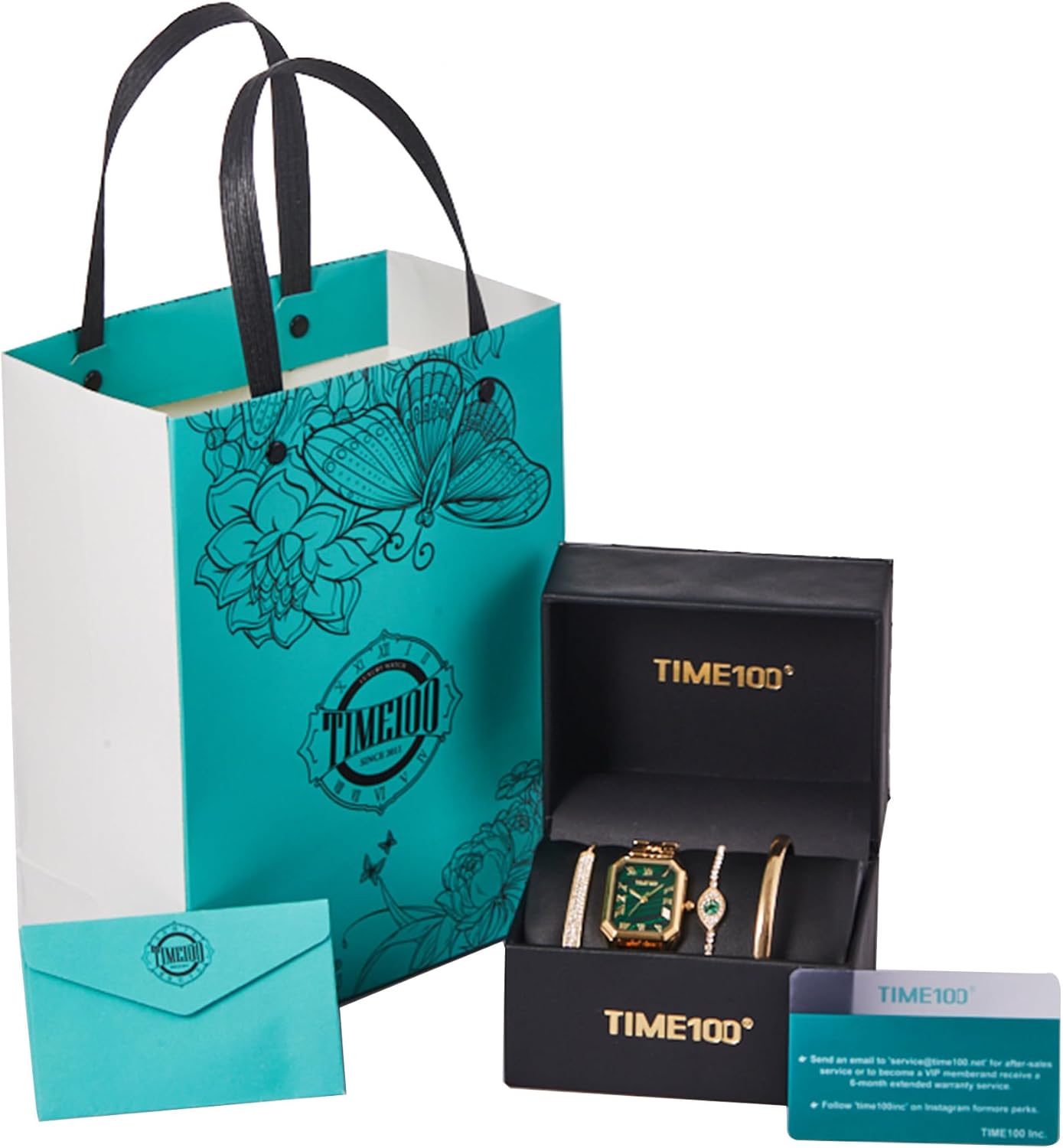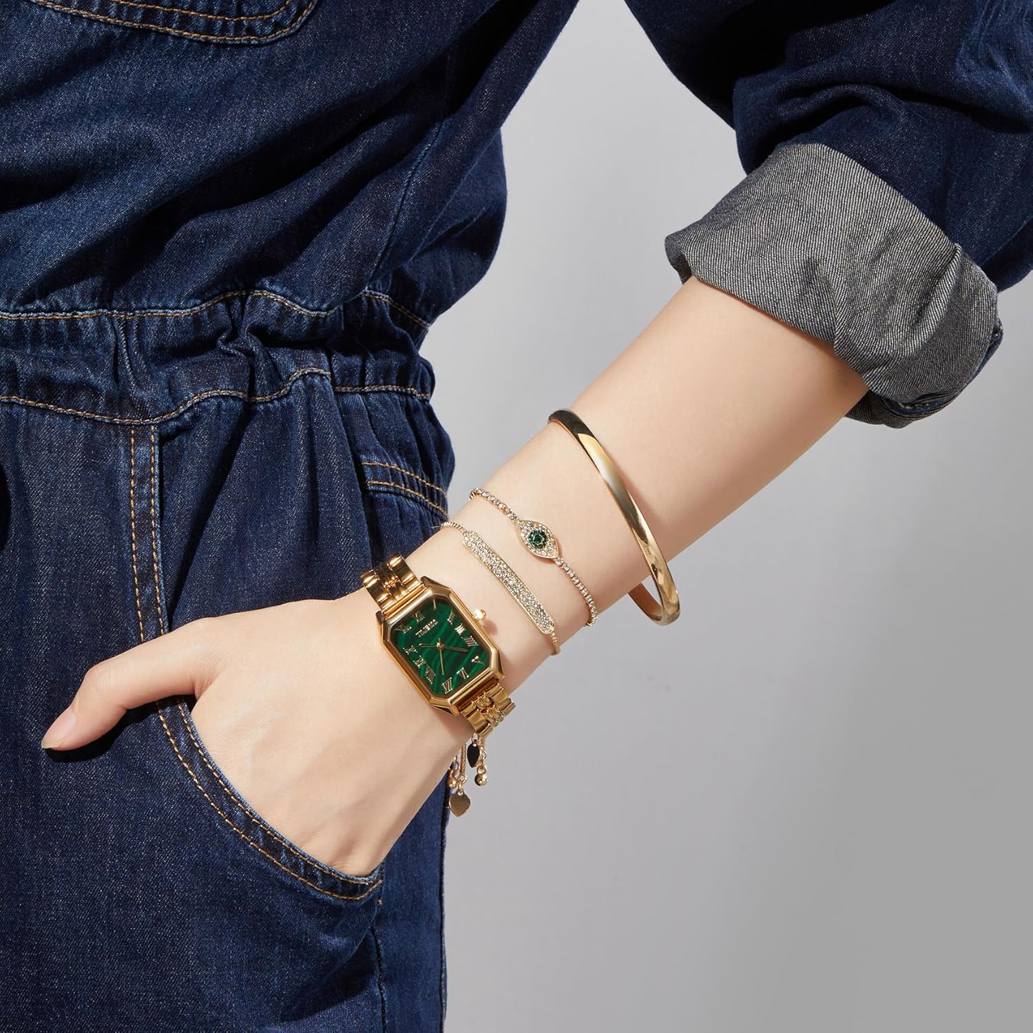 Mineral crystal lens; blue glossy dial with hands and markers;bangle