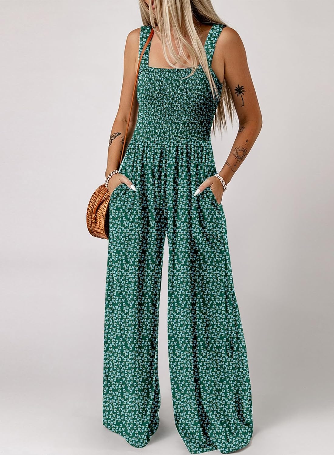 Feature: One Piece Sleeveless Jumpsuits, Square Neck, Wide Leg Pants, Two Side Pockets, Fashion Printed Jumpsuit, Stretchable Long Pants Jumpsuit, Loose Fit, Casual Style.