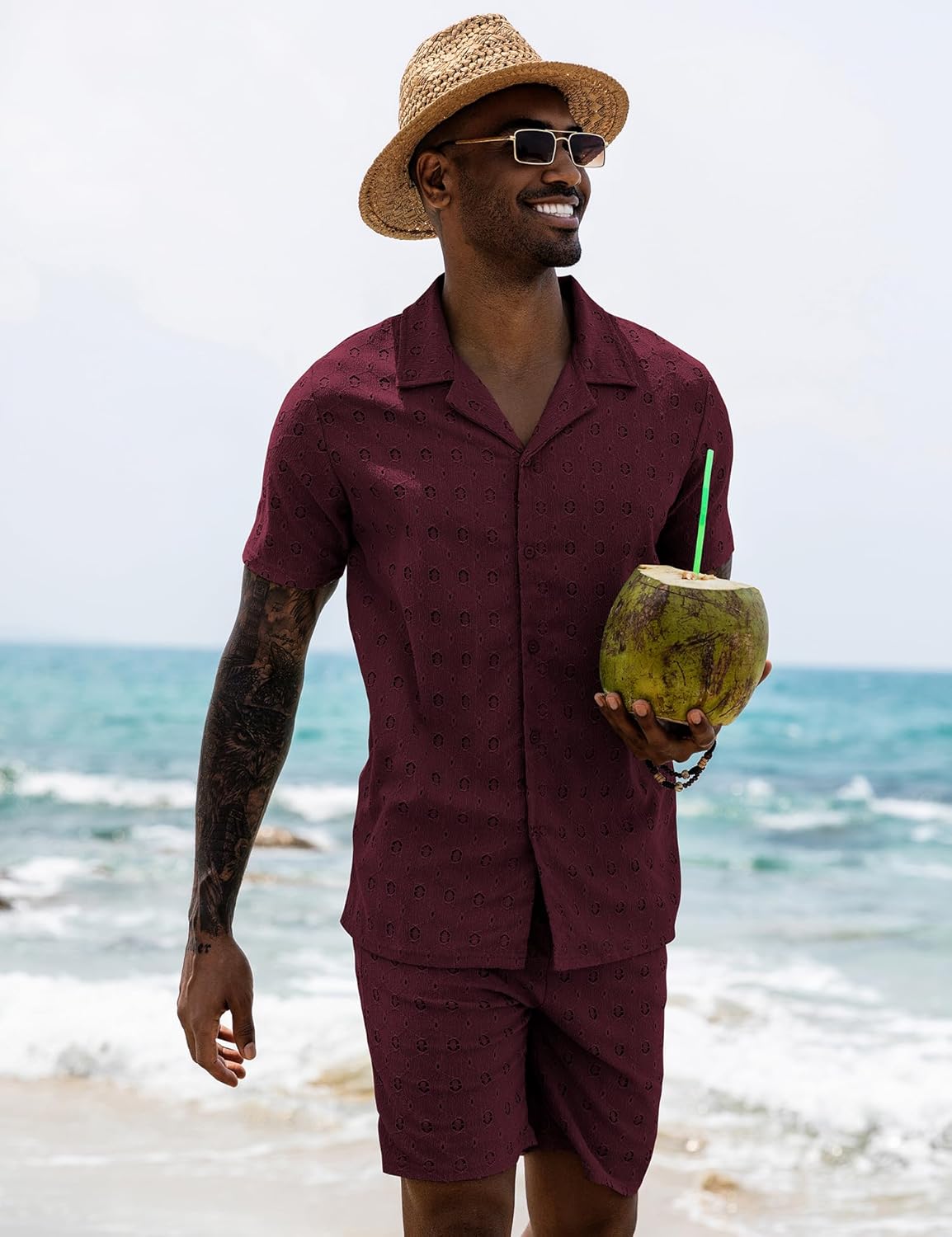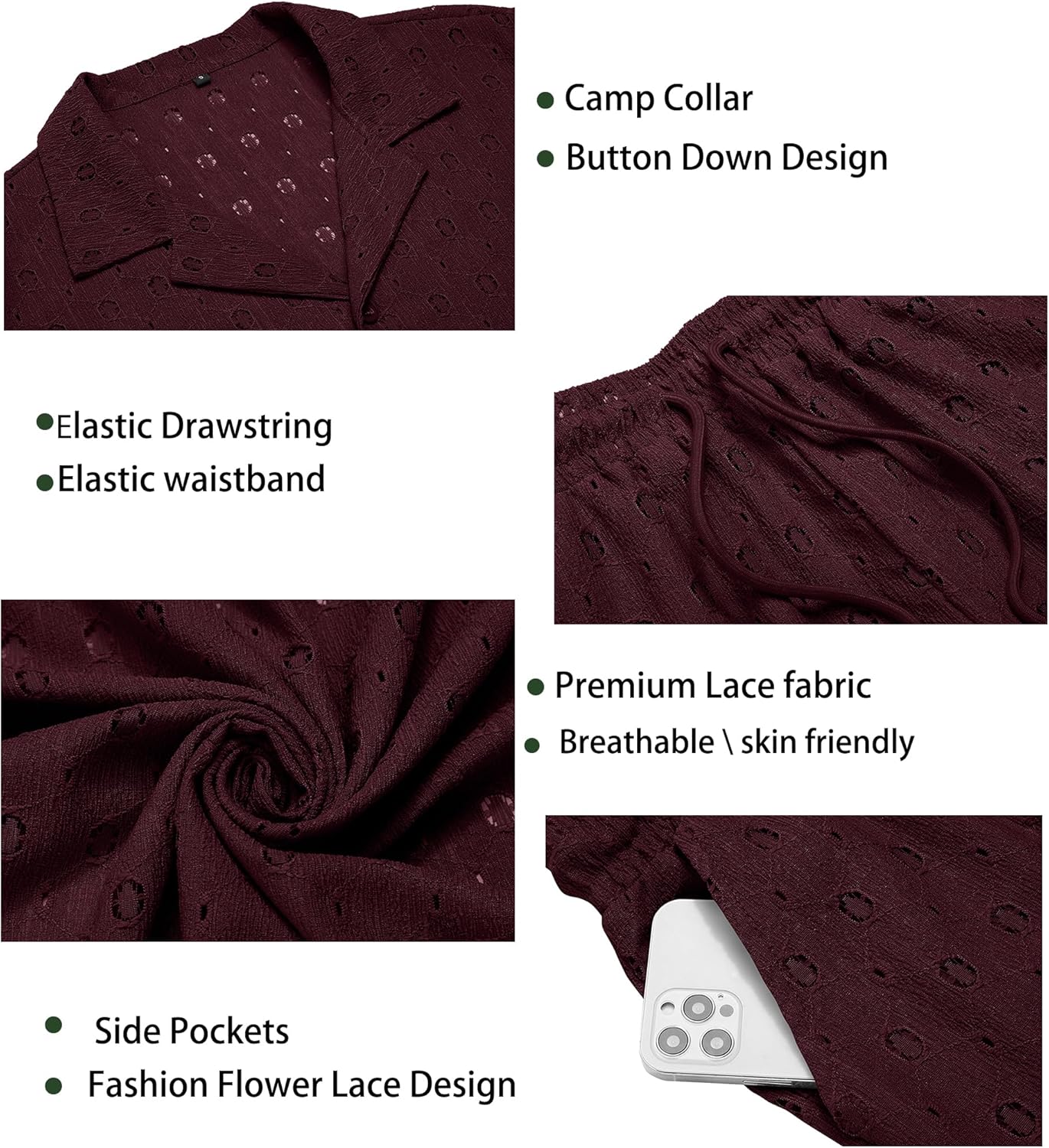 MEN SET DESIGN - This men's 2 Piece Outfits feathure soft and high quality hollow out lace fabric,solid color,short sleeve,button down closure dress shirt and elastic waist shorts are lined to prevent see-through with 2 pockets. See through hollow out pattern that brings you simple but unique style along with comfort!