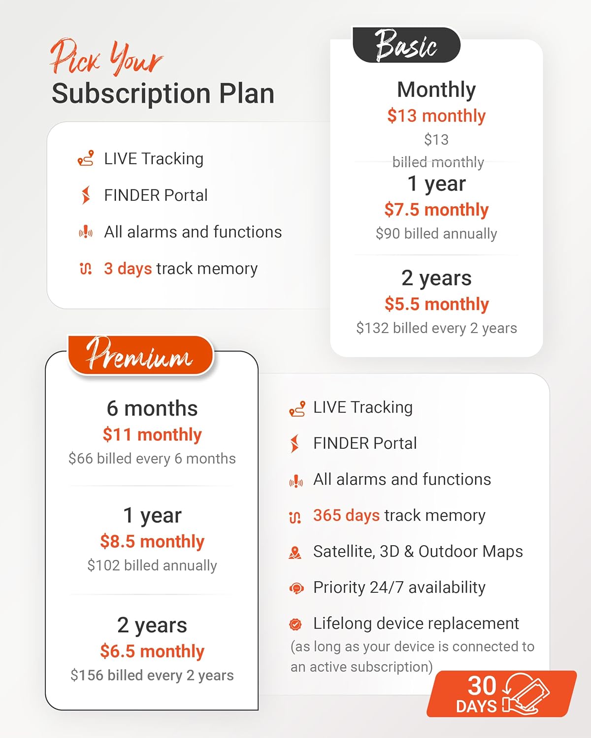 SUBSCRIPTION: Includes a SIM card and offers a lifelong device replacement, along with 24/7 customer support in multiple languages. Control your locators with our free app compatible with Android and iOS and share it with the whole family. Choose between the Premium or Basic plans, with options from monthly to every 2 years, from $5.50 per month, with payment frequency depending on the duration of the subscription. See pricing details in images.
