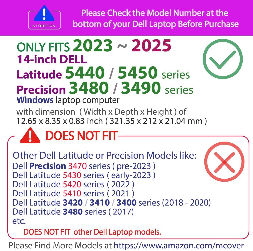 Designed to perfectly fit the 2023~2025 14" Dell Latitude 5440 / 5450 and Precision 3480 / 3490 series Windows Laptop with dimension of 12.65 x 8.35 x 0.83 inch ( 321.35 x 212 x 21.04 mm )