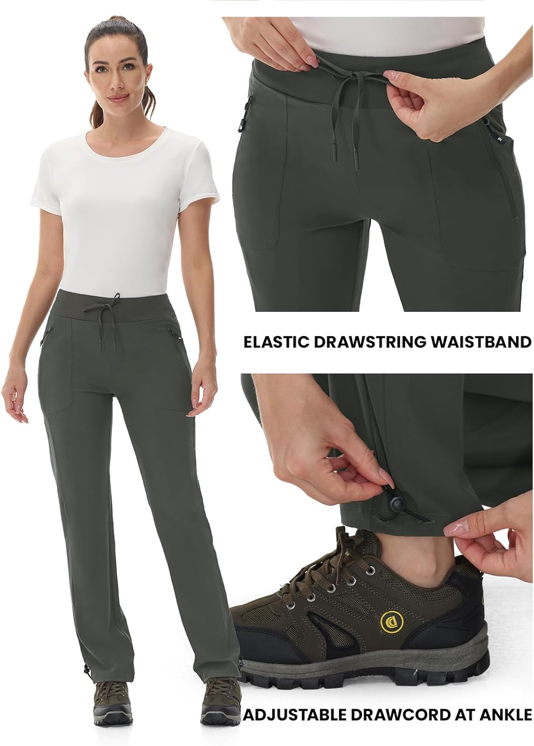 Adjustable drawstring waistband for a custom fit: These travel pants feature a wide elastic waistband with a drawcord, allowing you to adjust the fit to your liking. The slim fit and 4-way stretch fabric ensure maximum comfort and freedom of movement during any outdoor activity.