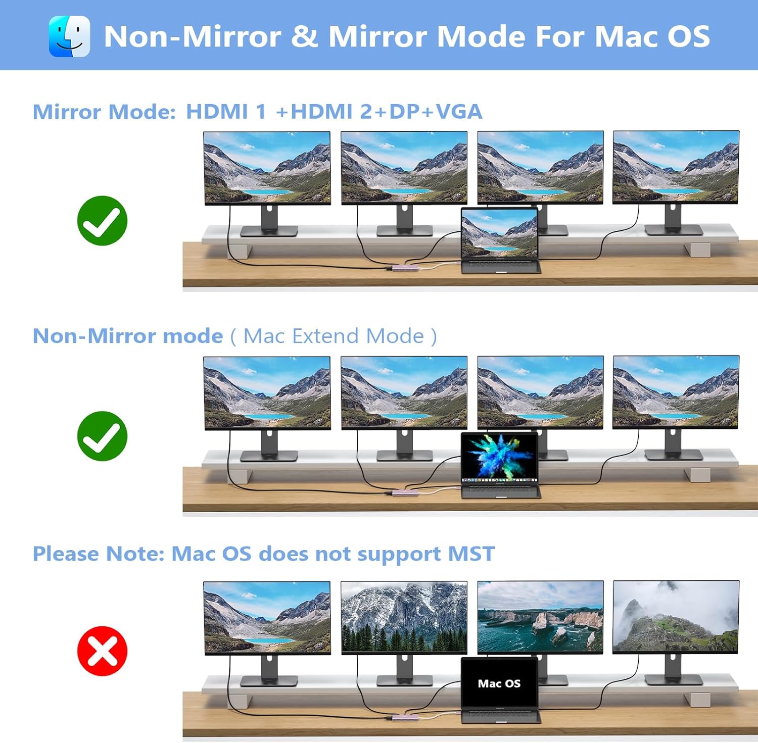 Docking Station 4K Display Adapter: The Laptop Docking Station with 4 video output ports: 2 HDMI+DP+VGA, can output up to 4K Dual/Triple Display videos; For quadruple display Dual HDMI, DP, and VGA all are 1080@60Hz. Please make sure your laptop specification support DP1.4 signal output. If the VGA port is connected, it will affect the resolution of all displays up to 1080P only