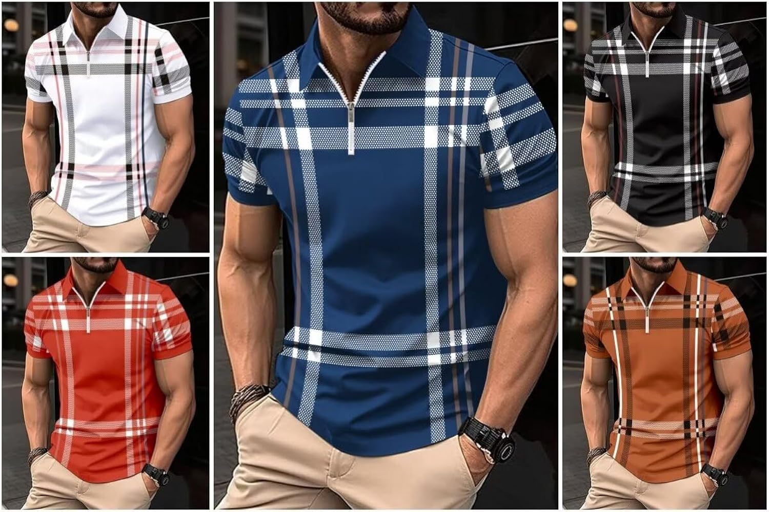 【CLASSIC DESIGN】Men's fashion showcasing a classic polo neck with zipper closure style,our shirts feature a unique stripe splicing for a fashion,casual style.