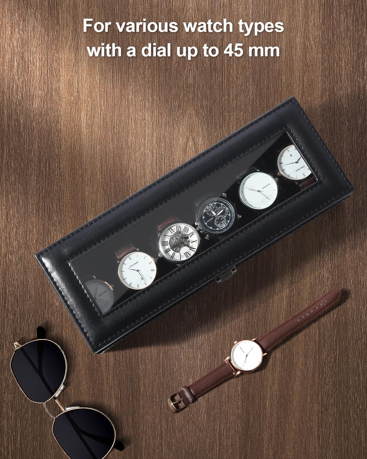 【6 Slots & Large Space】 This watch display case has 6 slots for most types of watches. With 6 shock-absorbing, soft watch pillows so you can take your most precious watches around the world in this compact and secure way.