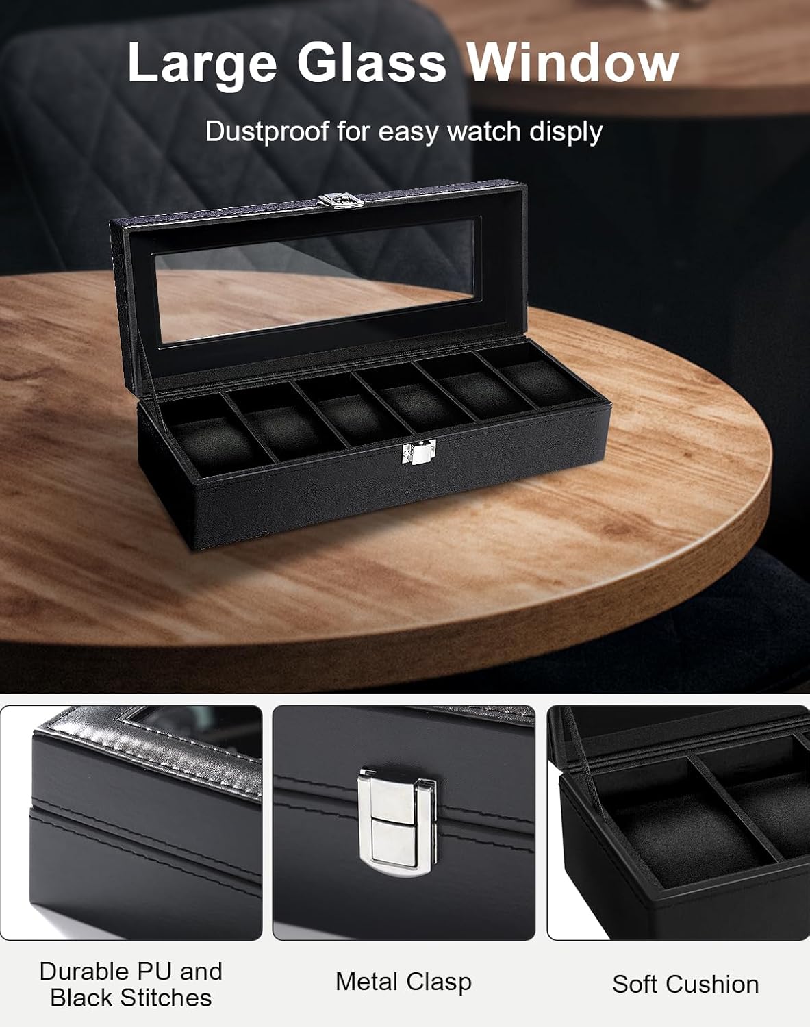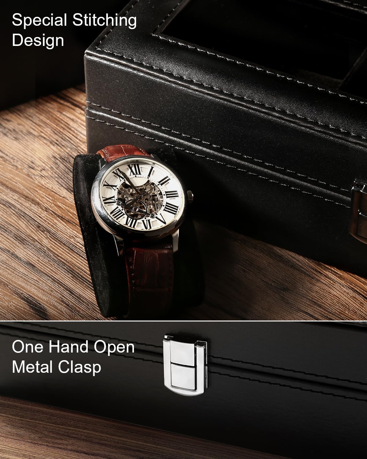【Premium & Durable】 The watch box is made of superior artificial PU leather for durability, lined with advanced soft velvet to create a home for your favorite watch, equipped with a durable metal clasp to prevent dust. Both outside and inside of this watch case are featured with detailed stitching around the edges. Overall exquisite and unique, soft texture will not scratch your watch.