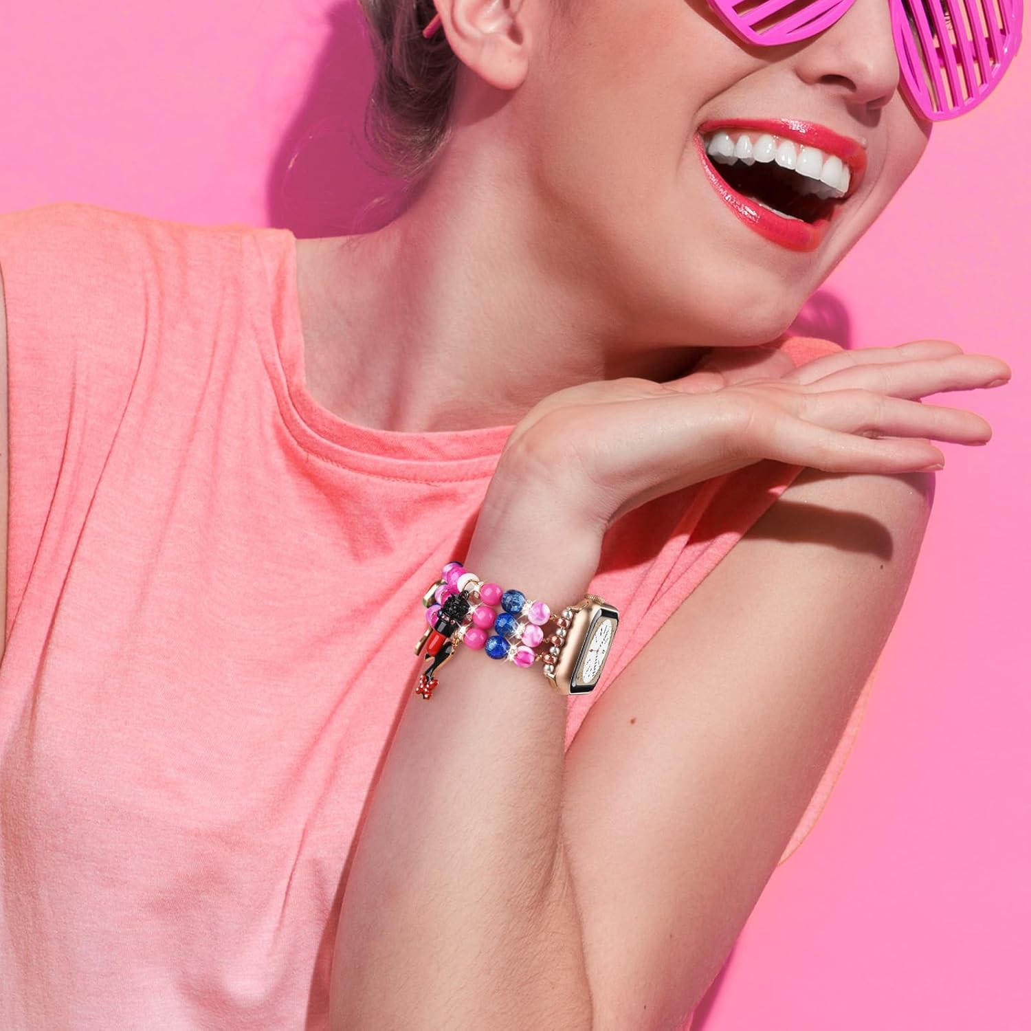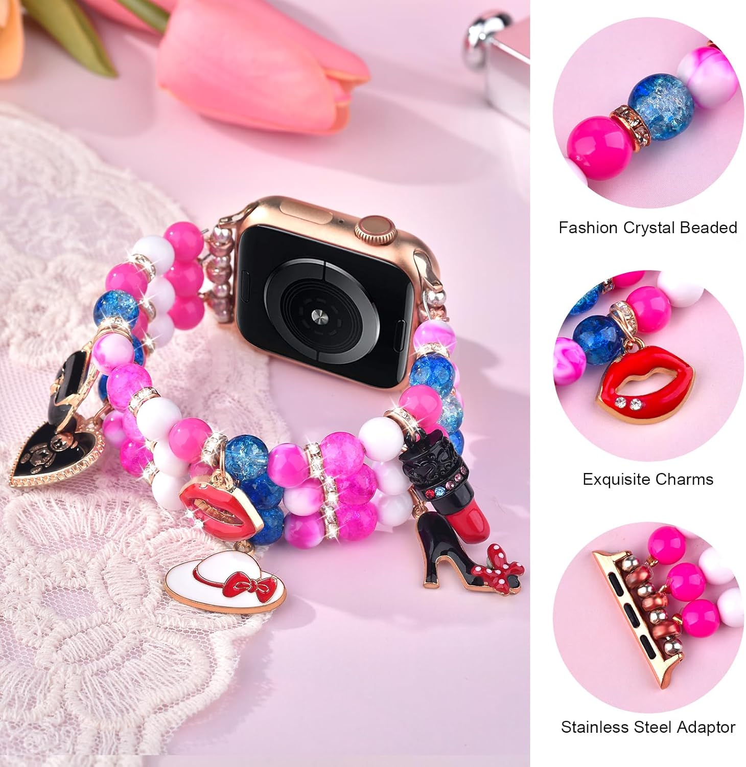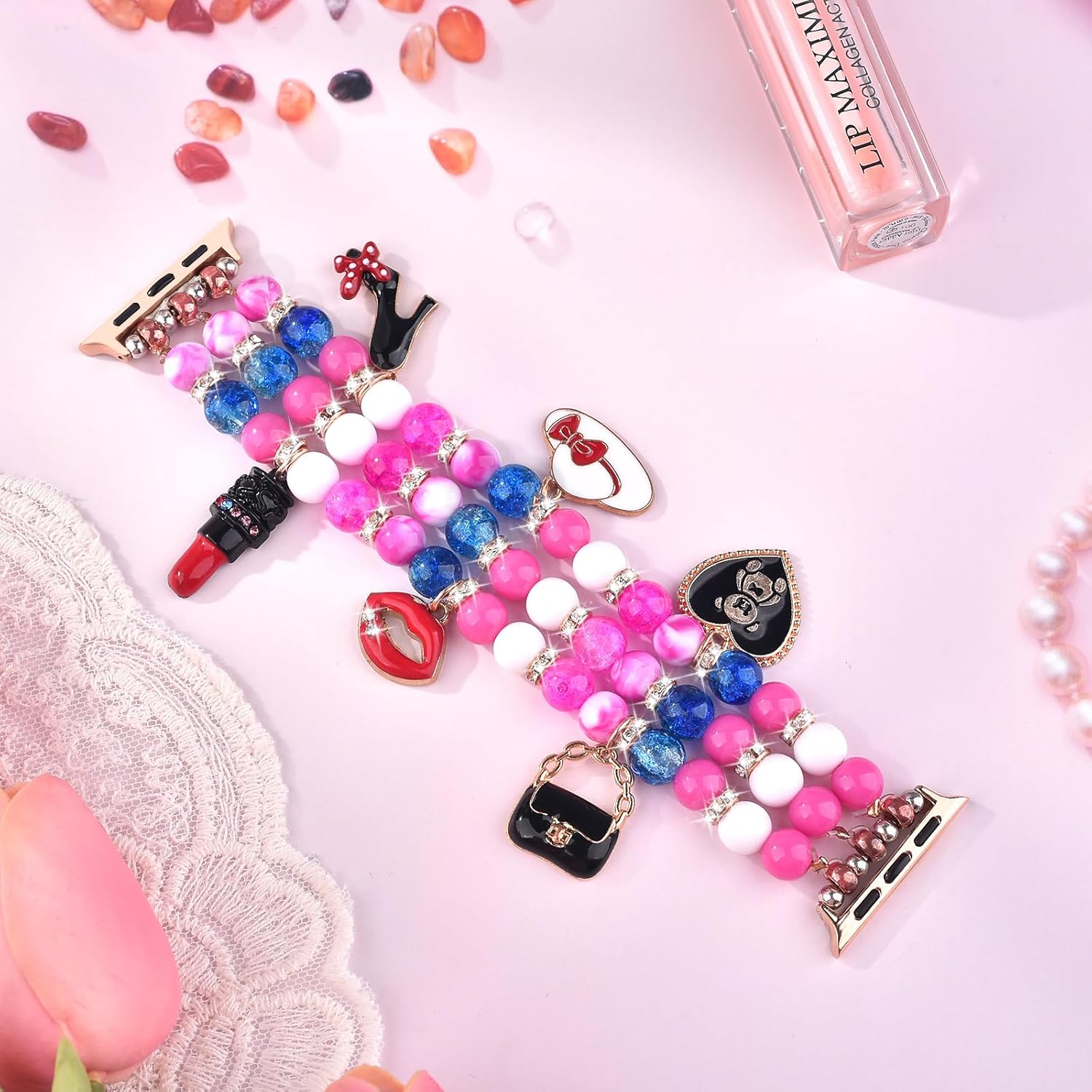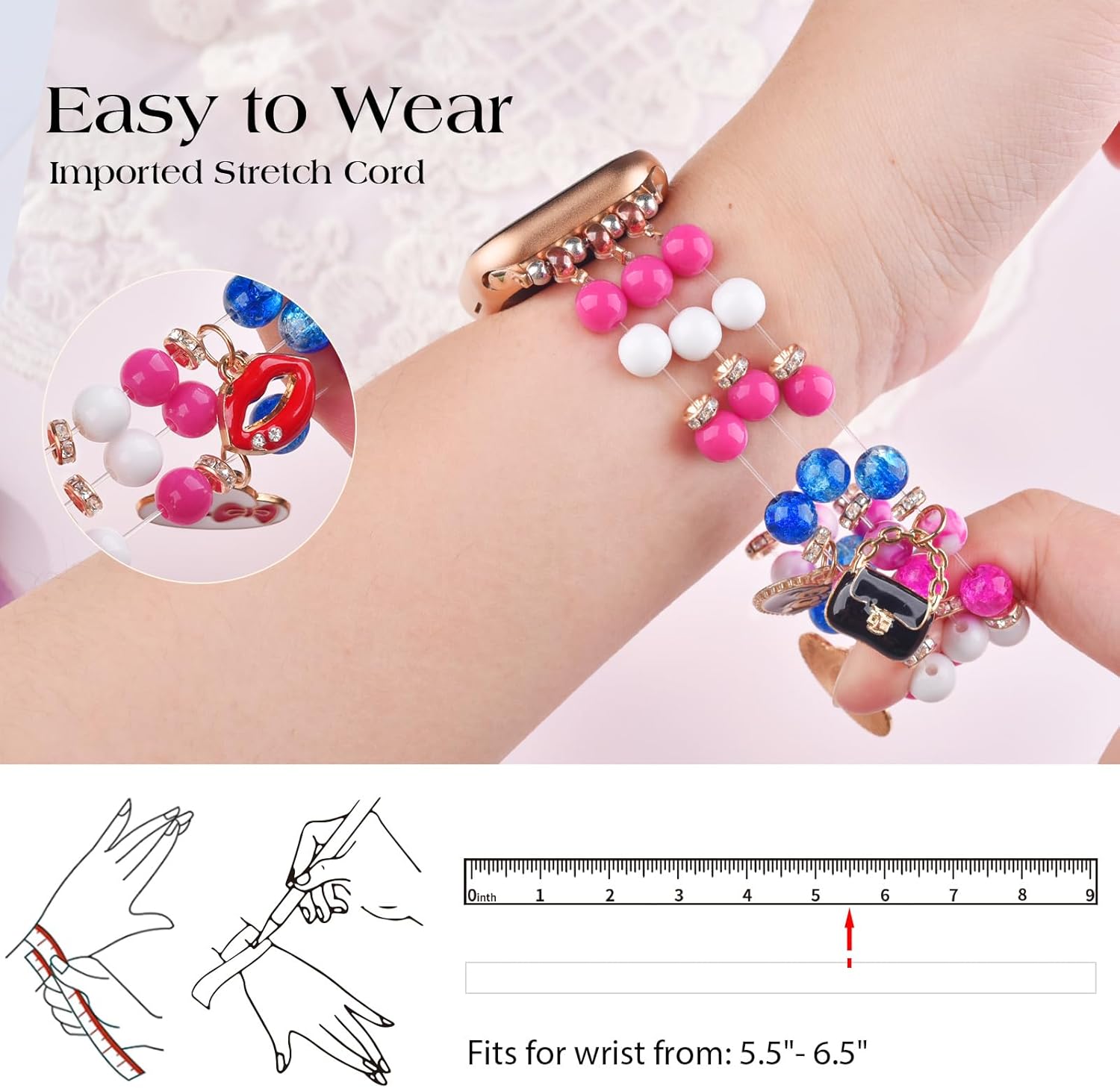 【High-quality Materials】The Apple Watch bracelet jewelry for women is made of natural beaded stones, cute colored character alloy pendants, glittering crystals, and stretch rope. It adds a touch of glamour to your look with the bracelet!