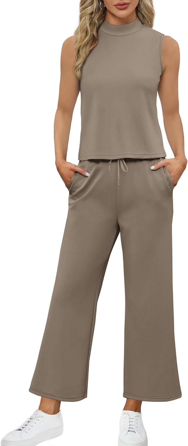 Design:Two Piece Sets for Women Mock Neck Sleeveless Tops,Wide Leg Crop Pants,Cropped Length,Contoured Back for The Most Flattering Rear View,Elastic Drawstring