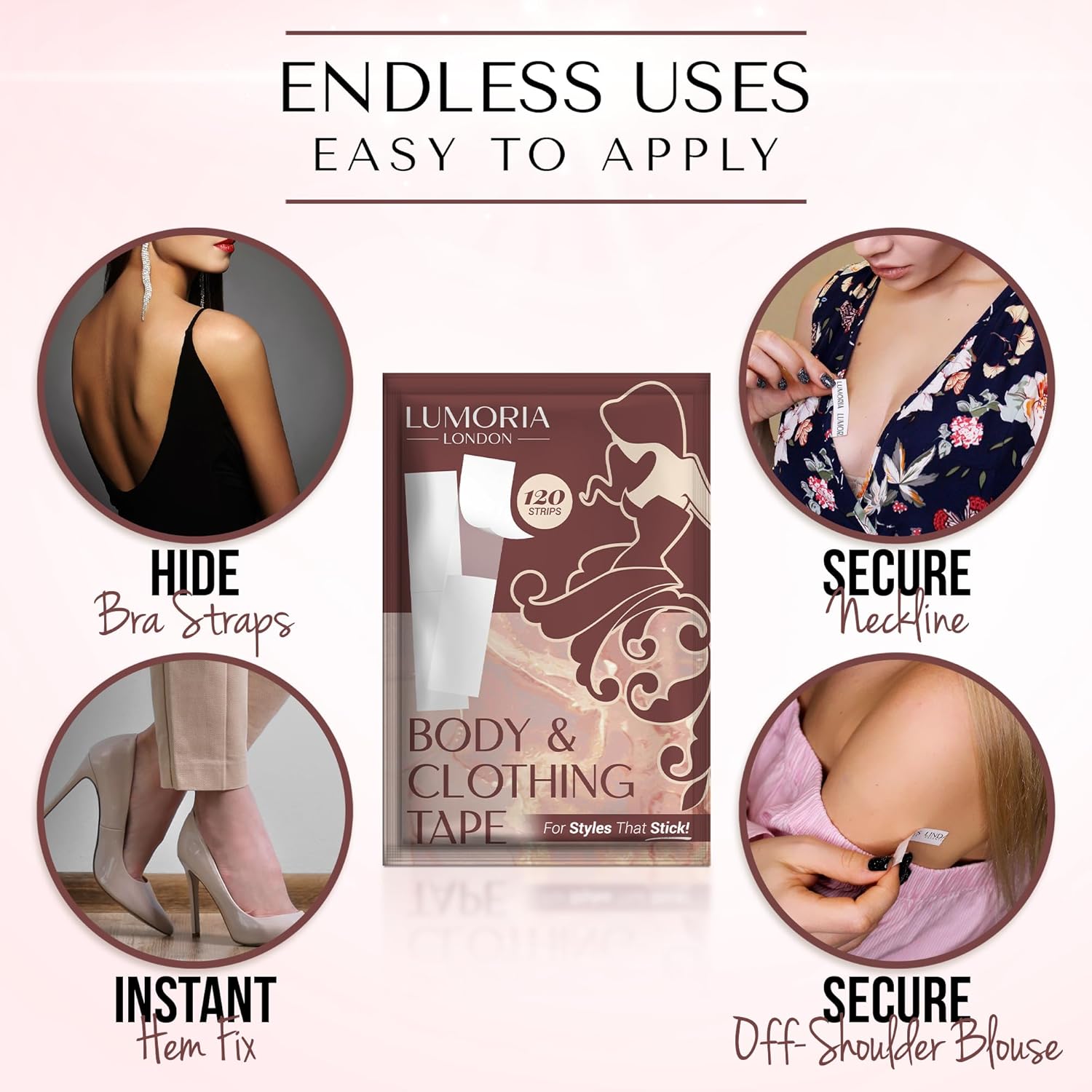 MOVE WITH CONFIDENCE: Women of today are always on the go! That’s why our tape is built to hold up to any movement. No need to stand still and be careful of your every step, feel confident as you embark on your day or night. Our double sided clothing tape has endless uses, from: securing necklines, eliminating blouse gaps, dress tape, bra tape, to instantly repairing hems. They are great for a quick wardrobe repair as each pack contains 120 strips 3" long X 0.5" wide