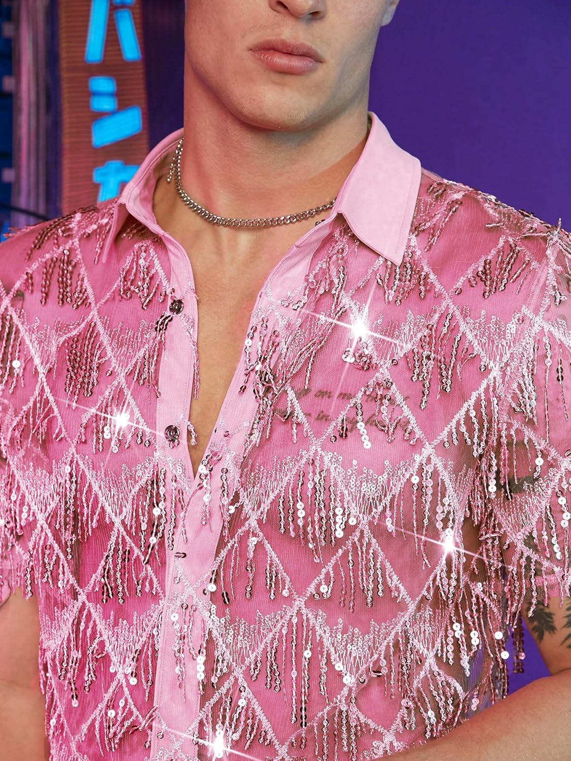 Features: contrast sequin, fringe, sheer, button front, shirt collar