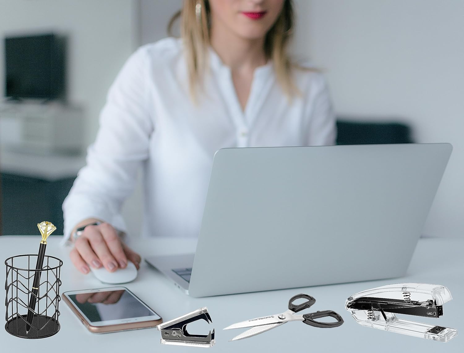 Packing Listing: 1x stapler, 1x staple remover, 1000 x staples, 1 x tape holder, 1 x pen holder, 1 x pen, 1 xscissors, 1 x box of binder clips, 1 x phone holder, ruler, 1 x transparent glue and a box of non-sticky notes; This gold office supplies set can meet your needs in daily life and work, keeping your desk or desk drawer organized.