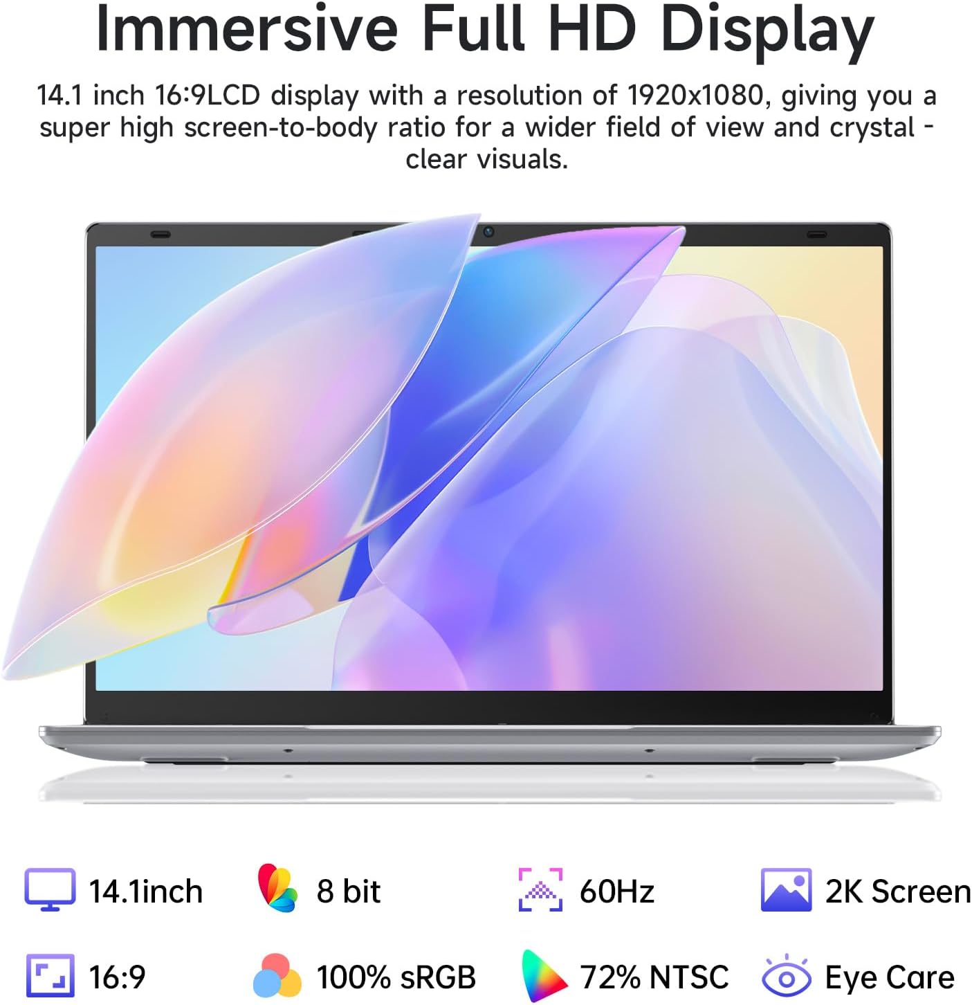 【14.1 Inch FHD IPS Screen】 Computer laptop is equipped with a 14.1 inch Full HD IPS display with a resolution of 1920 x 1080 pixels, 100% sRGB color gamut, FHD anti-glare screen and 180° IPS wide viewing angle with a micro-narrow bezel for an exceptional visual experience.