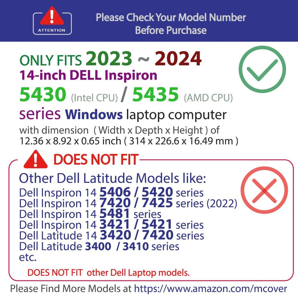 Designed to perfectly fit the 2023~2024 14" Dell Inspiron 14 5430 / 5435 series clamshell traditional Windows Notebook Computers with dimension of 12.36 x 8.92 x 0.65 inch( 314 x 226.6 x 16.49 mm )