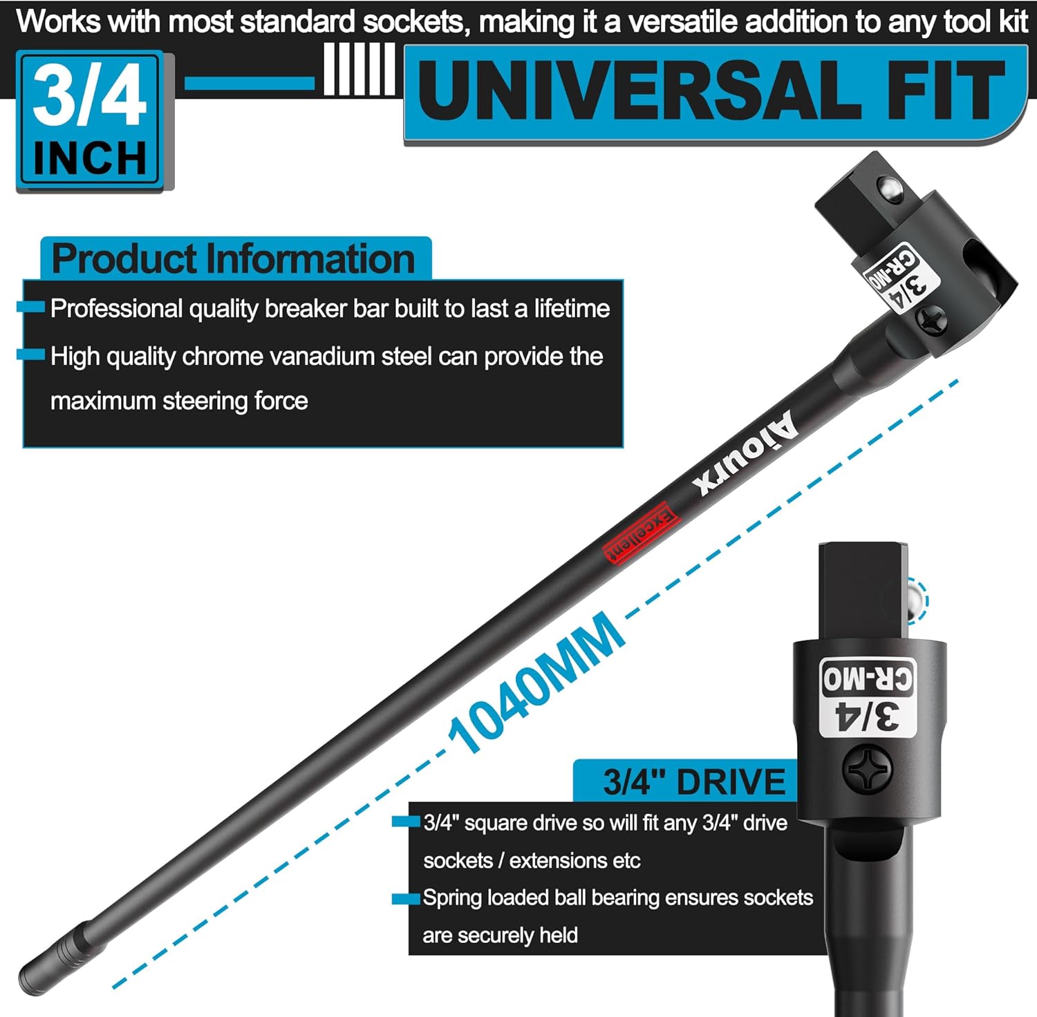 3/4" Drive 41 inch breaker bar is made of high quality chrome molybdenum steel, high strength and good wear resistance, to use