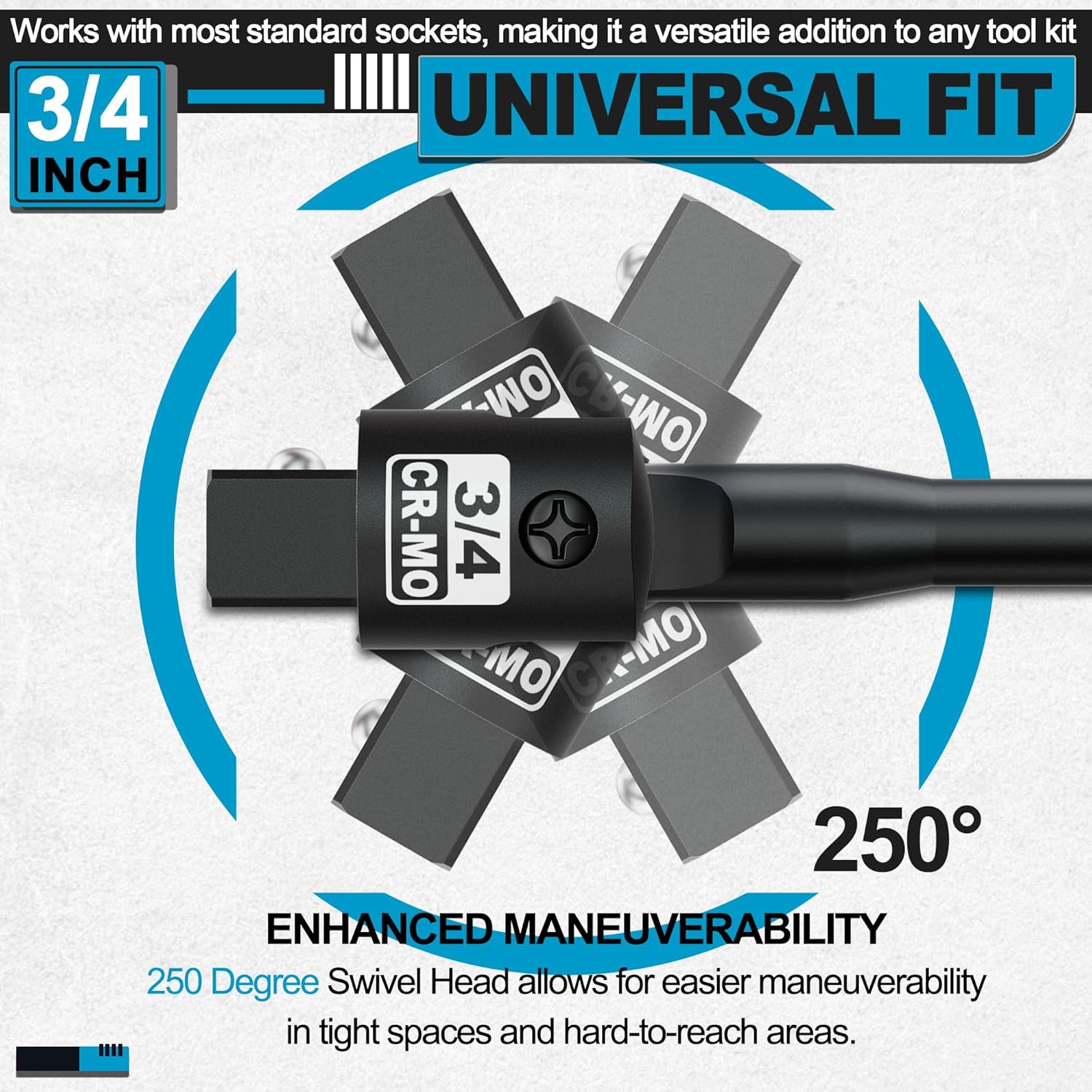 250 degree Flexible Cr-Mo head drive allow to reach into tight spaces, spring loaded ball bearing ensures sockets are securely held