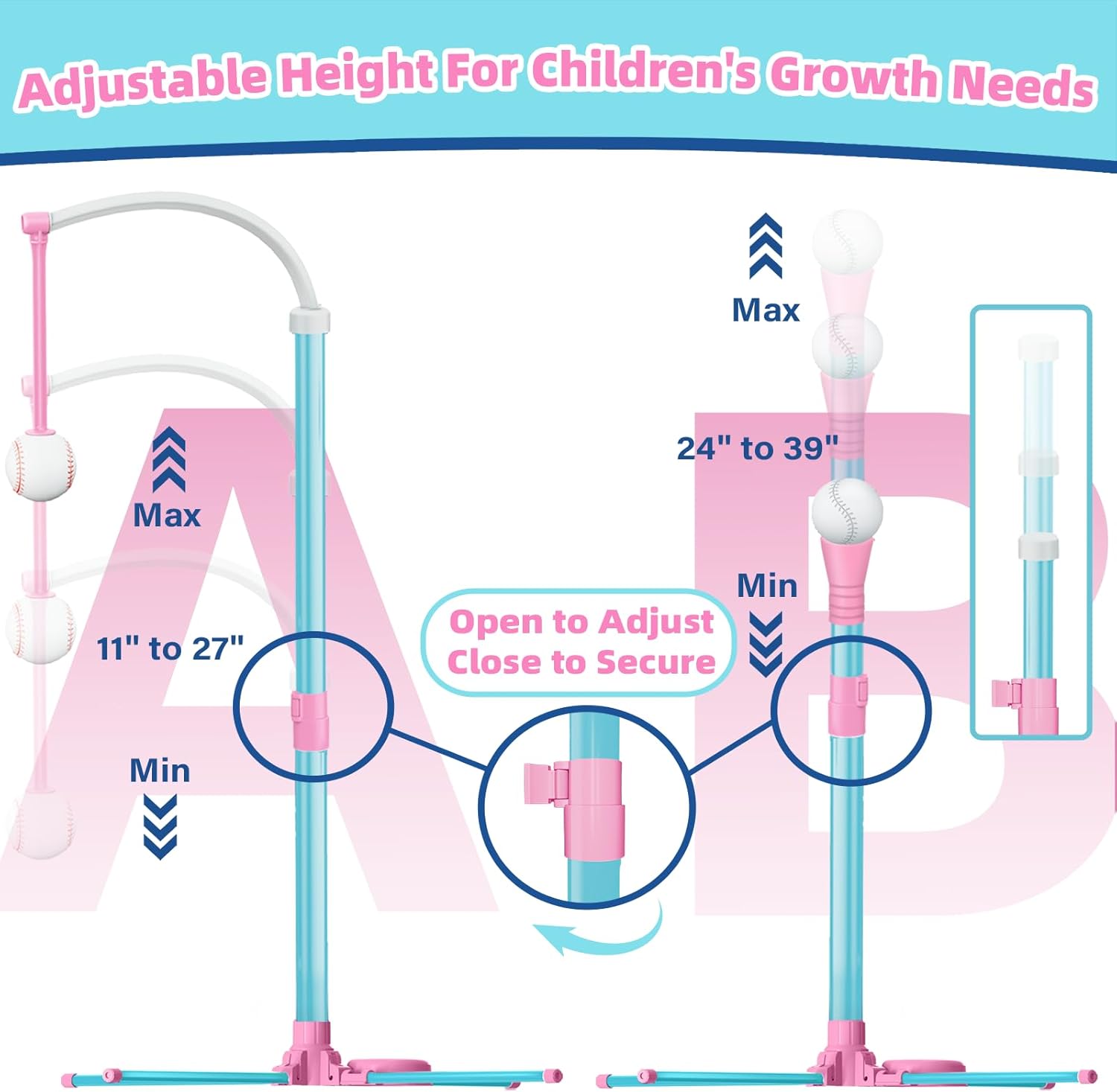 Height Adjustable Design Accommodates Children's Growth and Provides Versatility for Different Age Groups --- Surelect tee ball stand features an easy twist-and-lock mechanism, allowing you to customize the height for kids. ① Hanging Baseball Tee: Adjustable from 11" to 27" above the ground. ②Traditional Baseball Tee: Adjustable from 24" to 39" above the ground. This design adapts as your child grows, offering long-lasting value and flexibility.