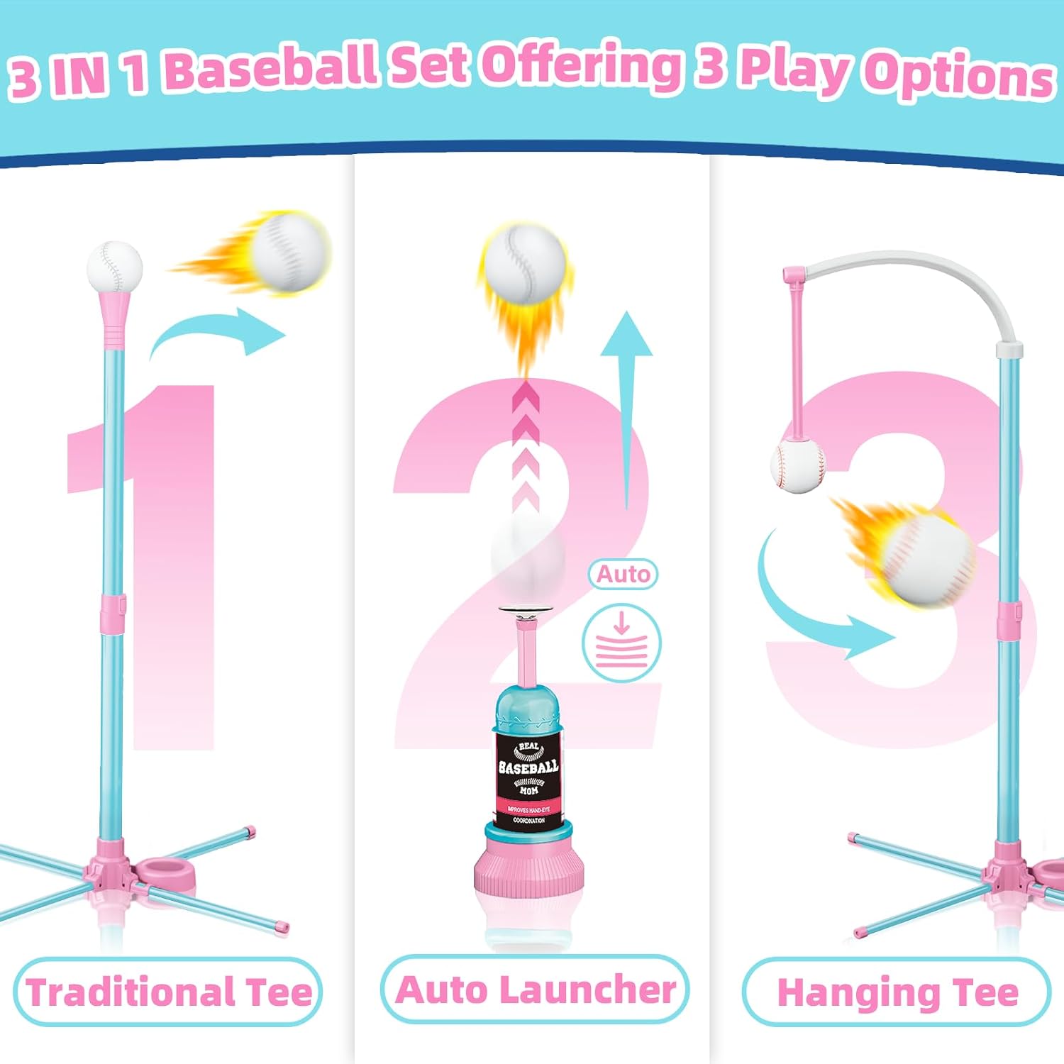3-in-1 Toddler T Ball Set with 3 Different Play Variations for Various Skill Levels and Preferences ---【Hanging Tee】: Employs self-stick technology to hold the ball at adjustable heights between 11" to 27" above the ground, providing hitters with practice hitting from various angles. 【Traditional Tee】: Ideal for helping children practice their hitting skills and improve hand-eye coordination. 【Automatic Launcher】: A baseball can bounce from the automatic tee to add more fun!