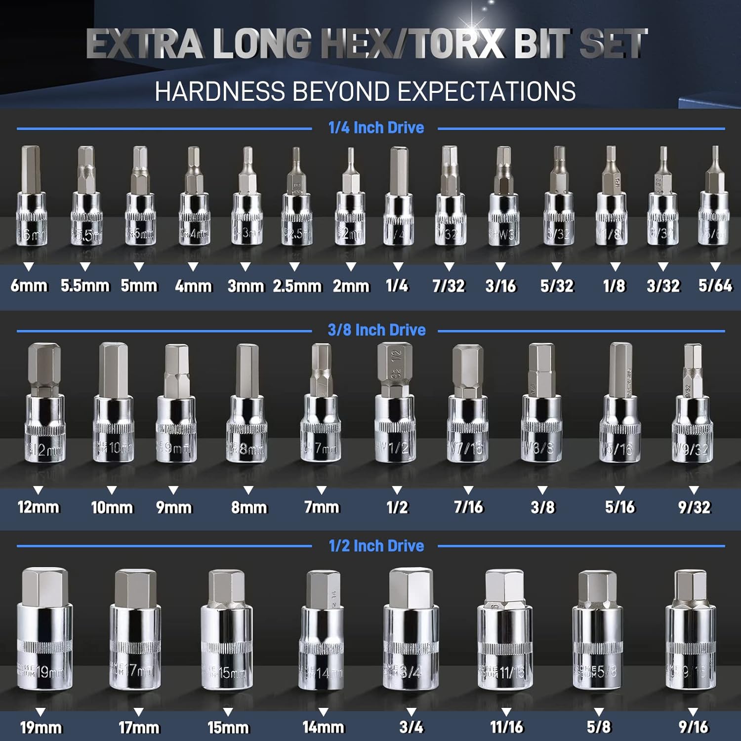 【SAE & Metric Size】DISEN 32 Pieces Hex Bit Socket Set provides both SAE and Metric size options: 16pc SAE HEX: 1/4 inch drive (5/64", 3/32", 1/8", 5/32", 3/16", 7/32", 1/4"), 3/8 inch drive (9/32", 5/16", 3/8", 7/16", 1/2"), 1/2 inch drive (9/16", 5/8", 11/16", 3/4"). 16pc Metric HEX: 1/4 inch drive (2, 2.5, 3, 4, 5, 5.5, 6mm), 3/8 inch drive (7, 8, 9, 10, 12mm), 1/2 inch drive (14, 15, 17, 19mm)