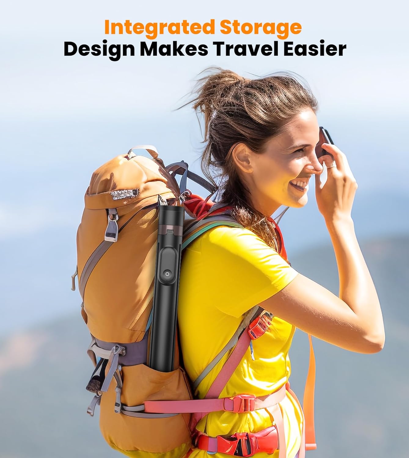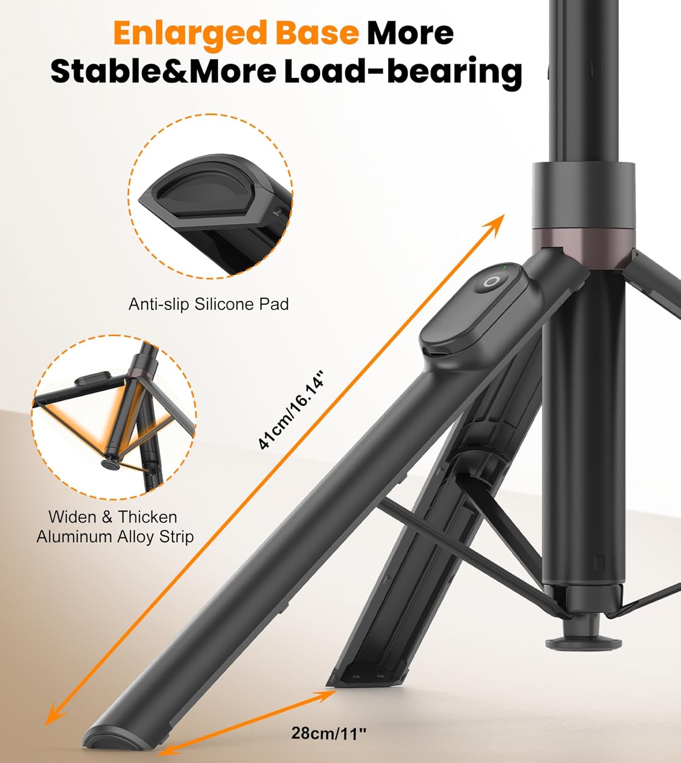 Larger & More Stable Base : The cell phone tripod base adopts a stable triangular structure, each leg is 28cm/11" long, and the maximum span of the base is 41cm/16.14", which makes the tripod more stable. (Please note that the cellphone tripod should be placed on a flat surface.) The folding design of the selfie stick tripod with remote is very portable, you can put it in your backpack or suitcase and take it with you when you are traveling.