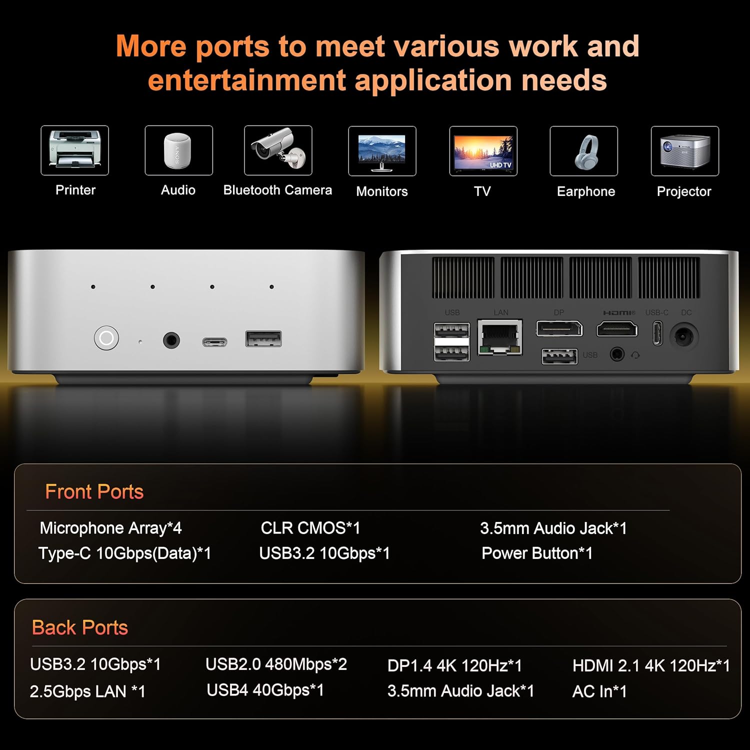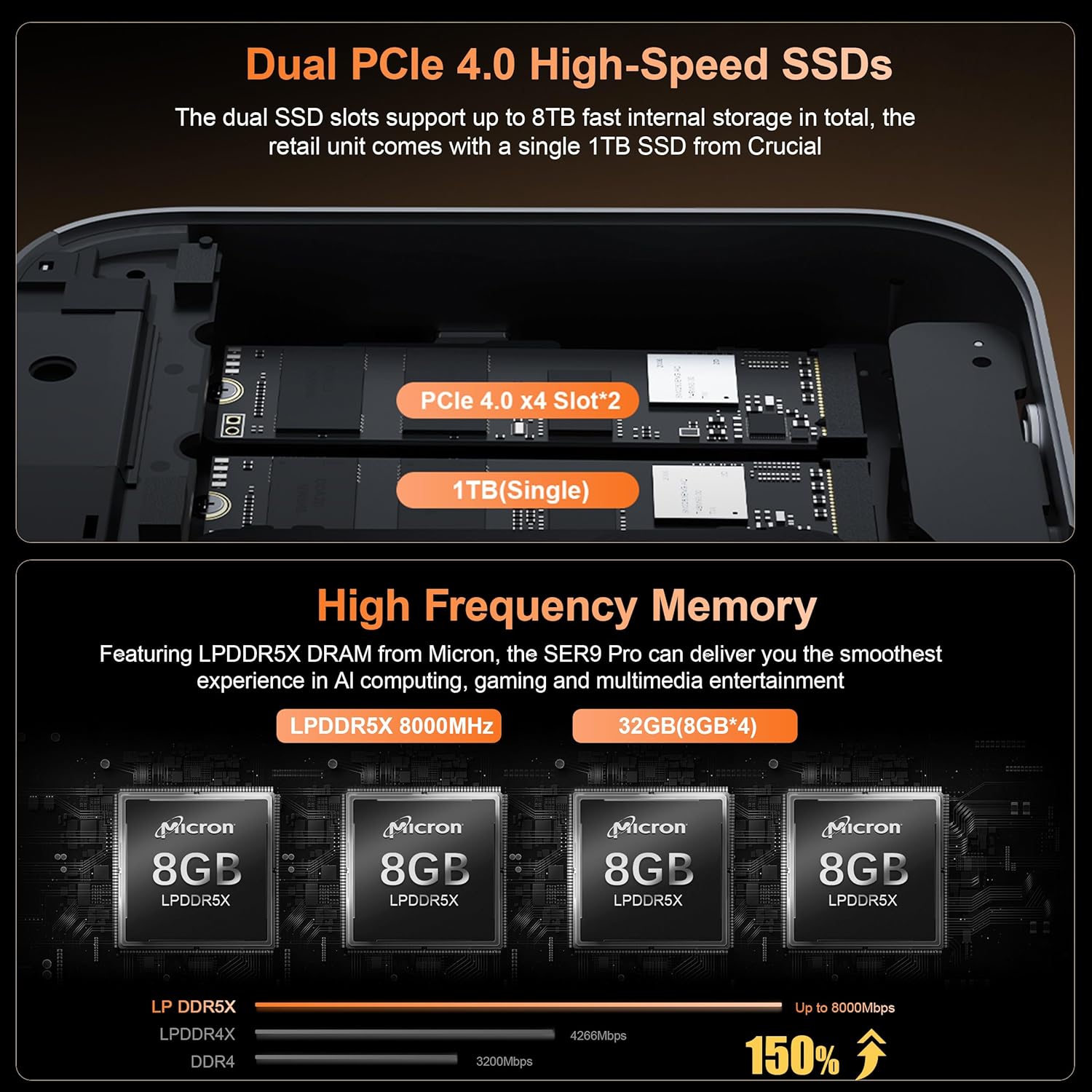 【Massive Storage & Expandability】Beelink Mini PC comes with 32GB LPDDR5X 8000MHz High Frequency Memory,1TB PCIe4.0 SSD, for heavy workloads.There are also Dual M.2 PCle 4.0 x4 SSD slots under the hood, supporting up to 8TB of fast internal storage. Ideal for creators and gamers needing rapid storage and memory expansion