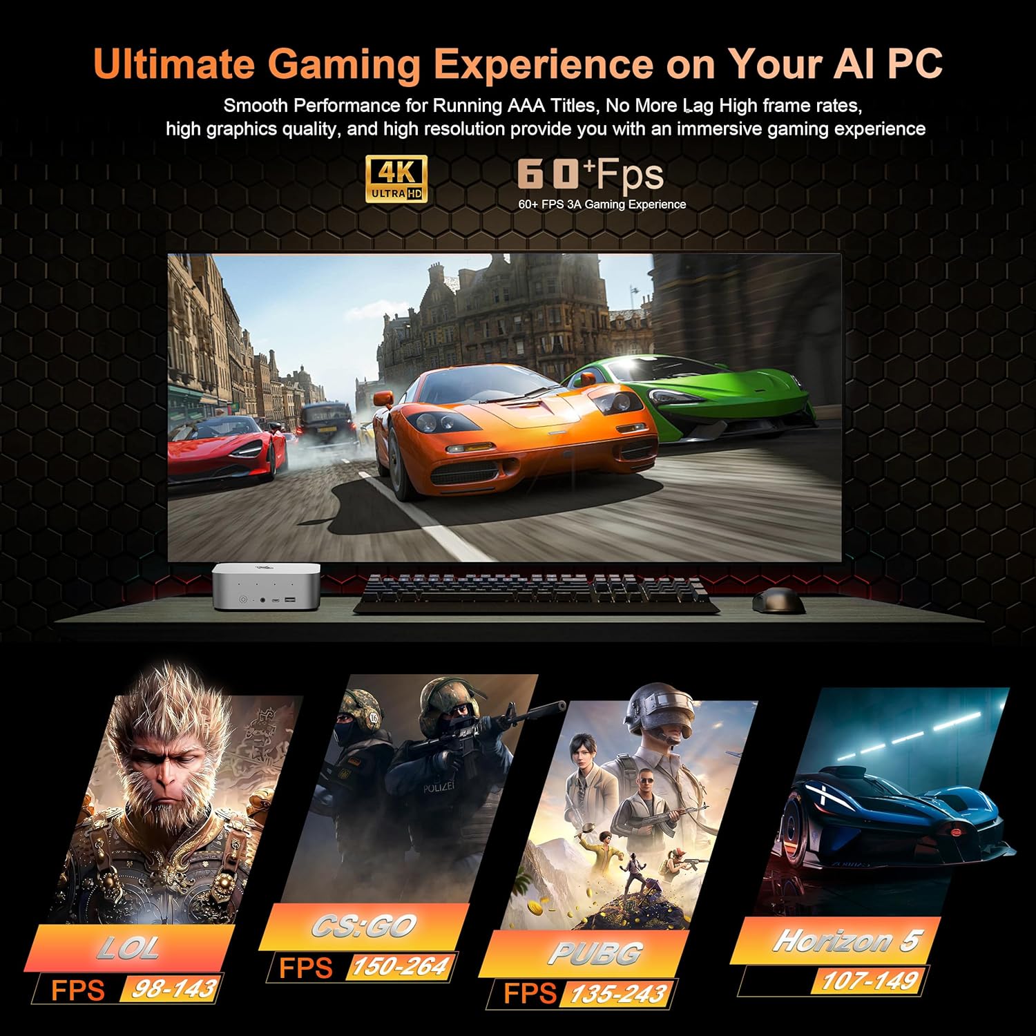 【80 TOPS AI Power, Boosted Efficiency】 Ryzen AI 9 HX370 Mini Gaming pc Integrated XDNA 2 NPU (50 TOPS) + CPU/GPU synergy achieves 3x faster AI response. Supports 5-meter 360° AI voice interaction (noise cancellation), AI art creation, and office acceleration for productivity
