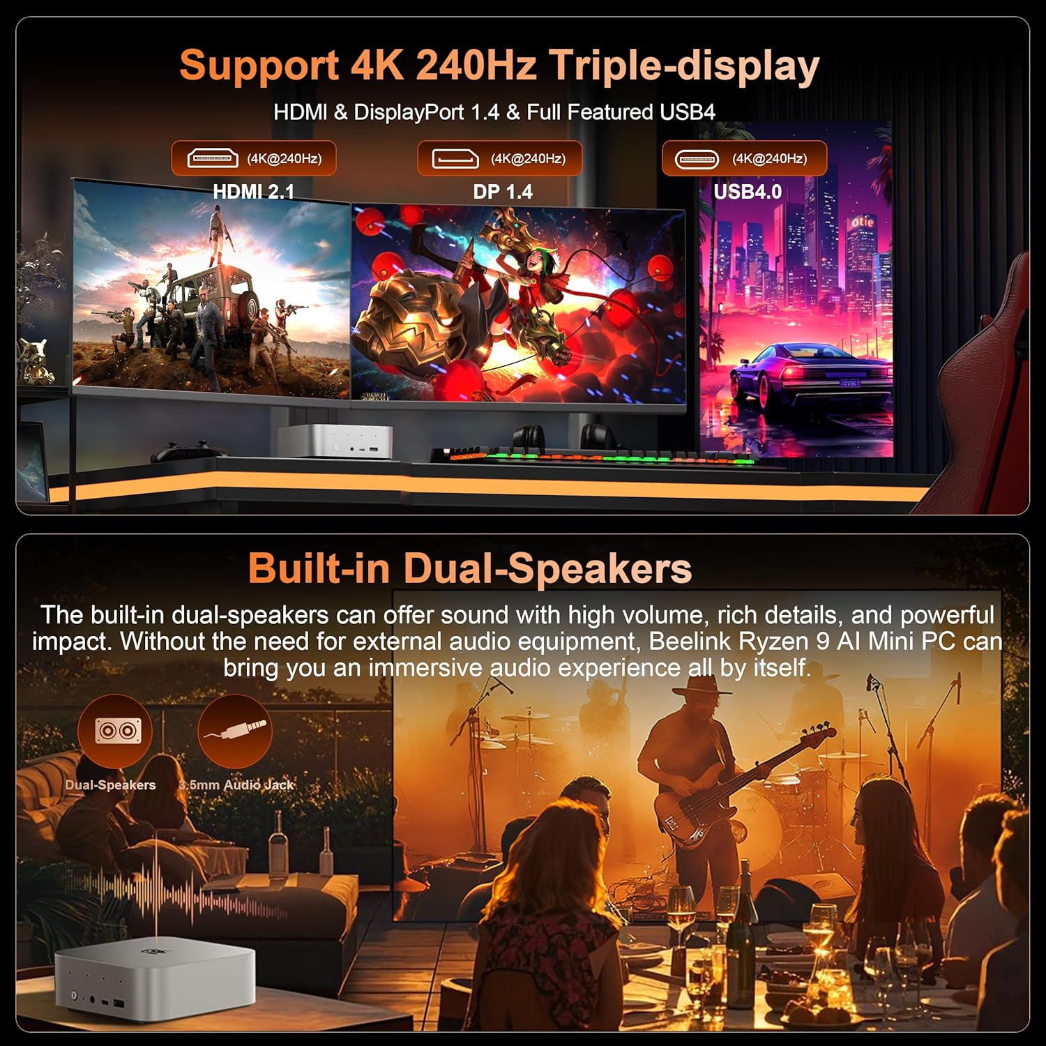 【Silent & Versatile Connectivity】 Beelink SER9 Ultra-quiet cooling (32 dB low decibel) + dual built-in speakers. Wi-Fi 6 (2.4 Gbps), Bluetooth 5.2, and USB4 (40Gbps) ensure stable connections. adapts to office, streaming, smart home, and entertainment setups
