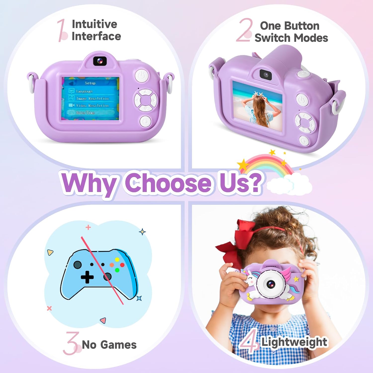 32MP Dual Lens Take Selfies and 1080P Video Recording: This kid camera is equipped with 32MP front and rear dual lens and HD 1080P, kids can easier capture details to take pictures and selfies and make fun videos. This kids toy camera also has multiple funny photo frames to enhance kids' creativity, kids can experiment with different effects to make each photo fun and different. This is a fun and educational camera that provides hours of entertainment while teaching valuable skills to your kids