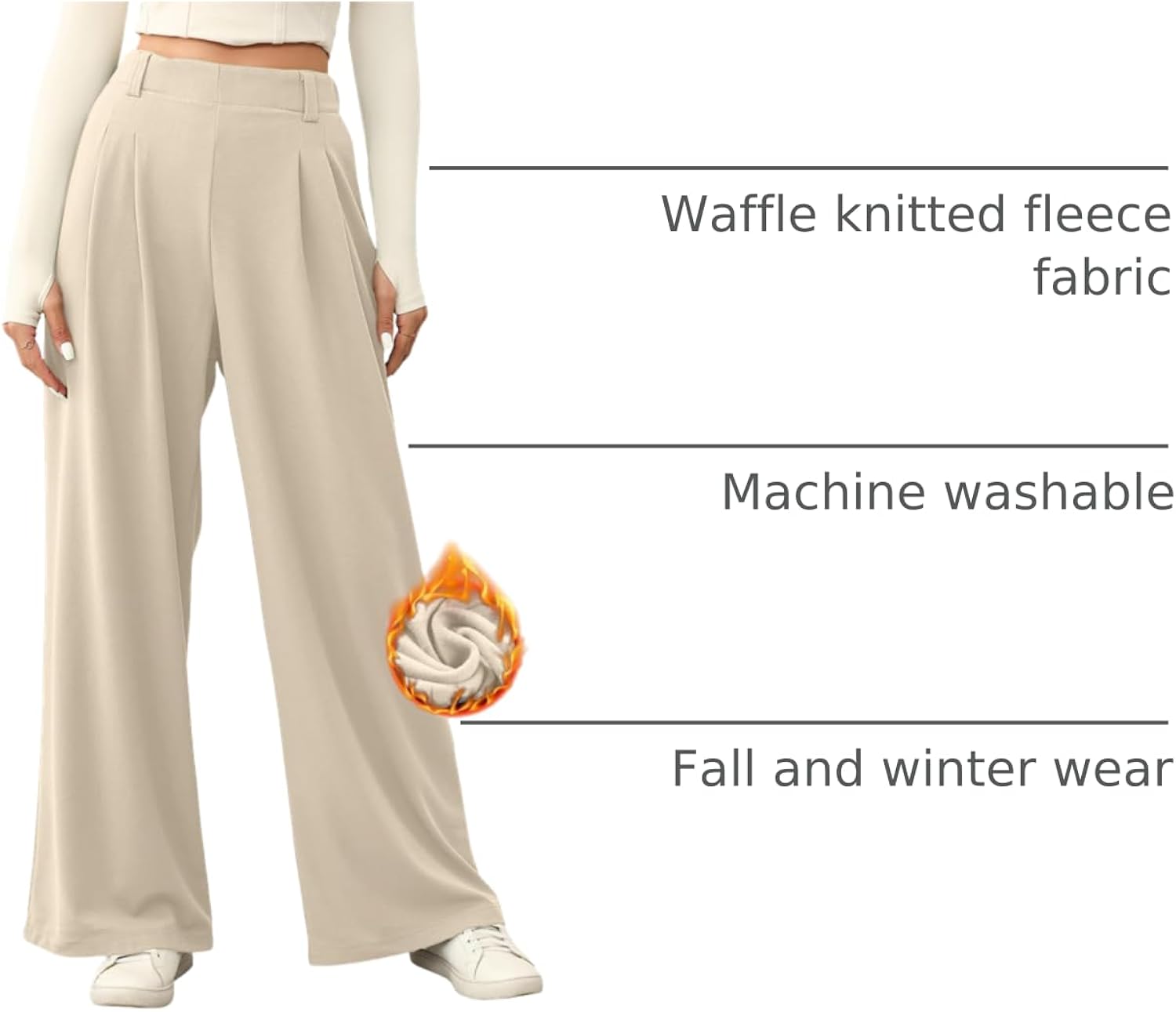 Design: Business casual pants for women, wide legged pants, high waisted pants, pleated front, elastic waistband in the back, comfy palazzo pants, plain solid color, loose fit flowy trousers, womens fleece pants with pockets, 2 side slant pockets, fall winter warm lounge pants