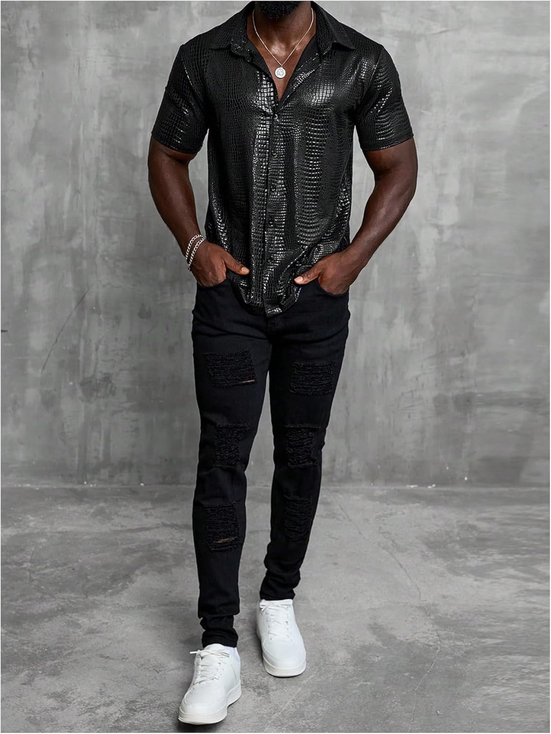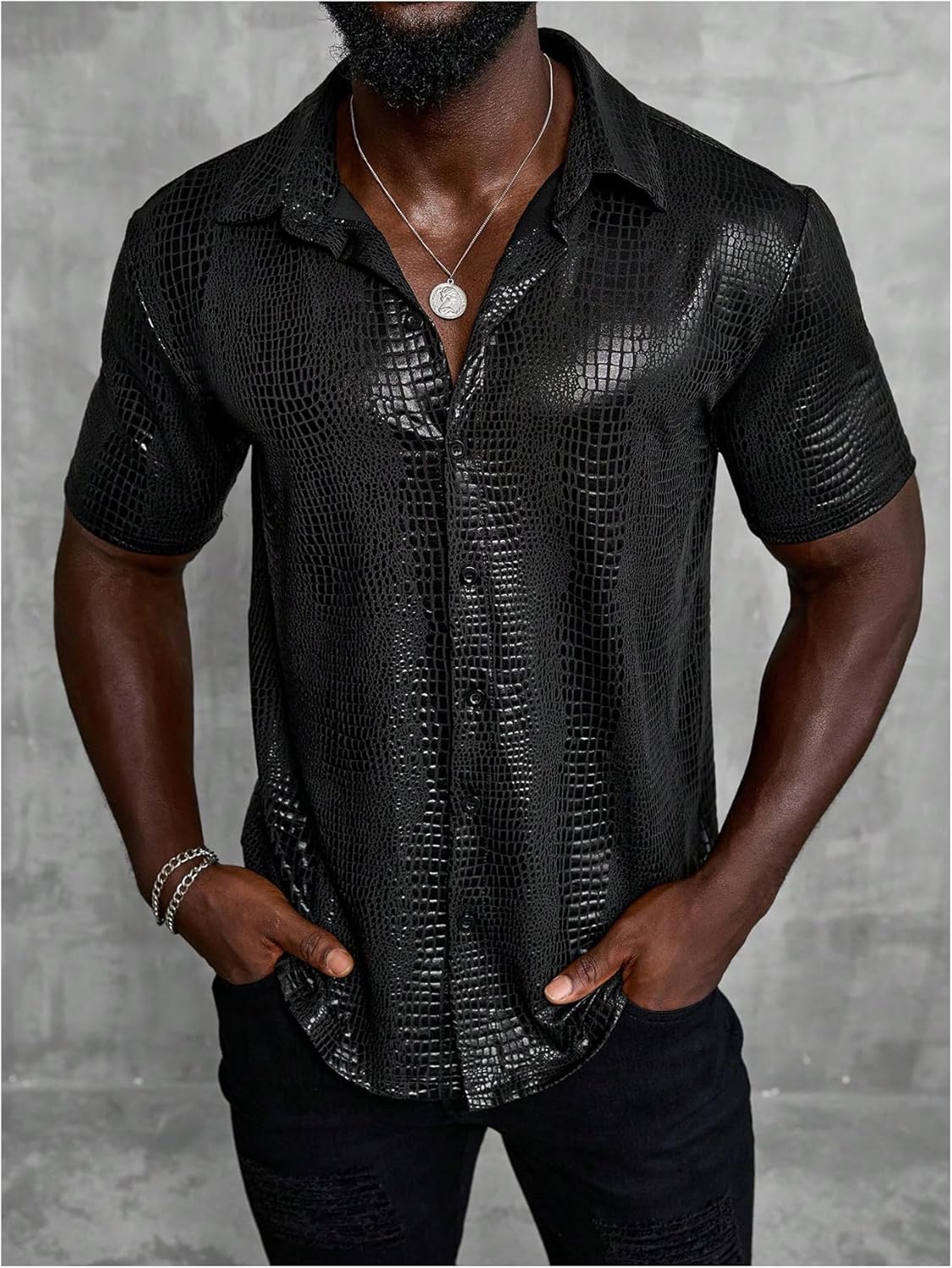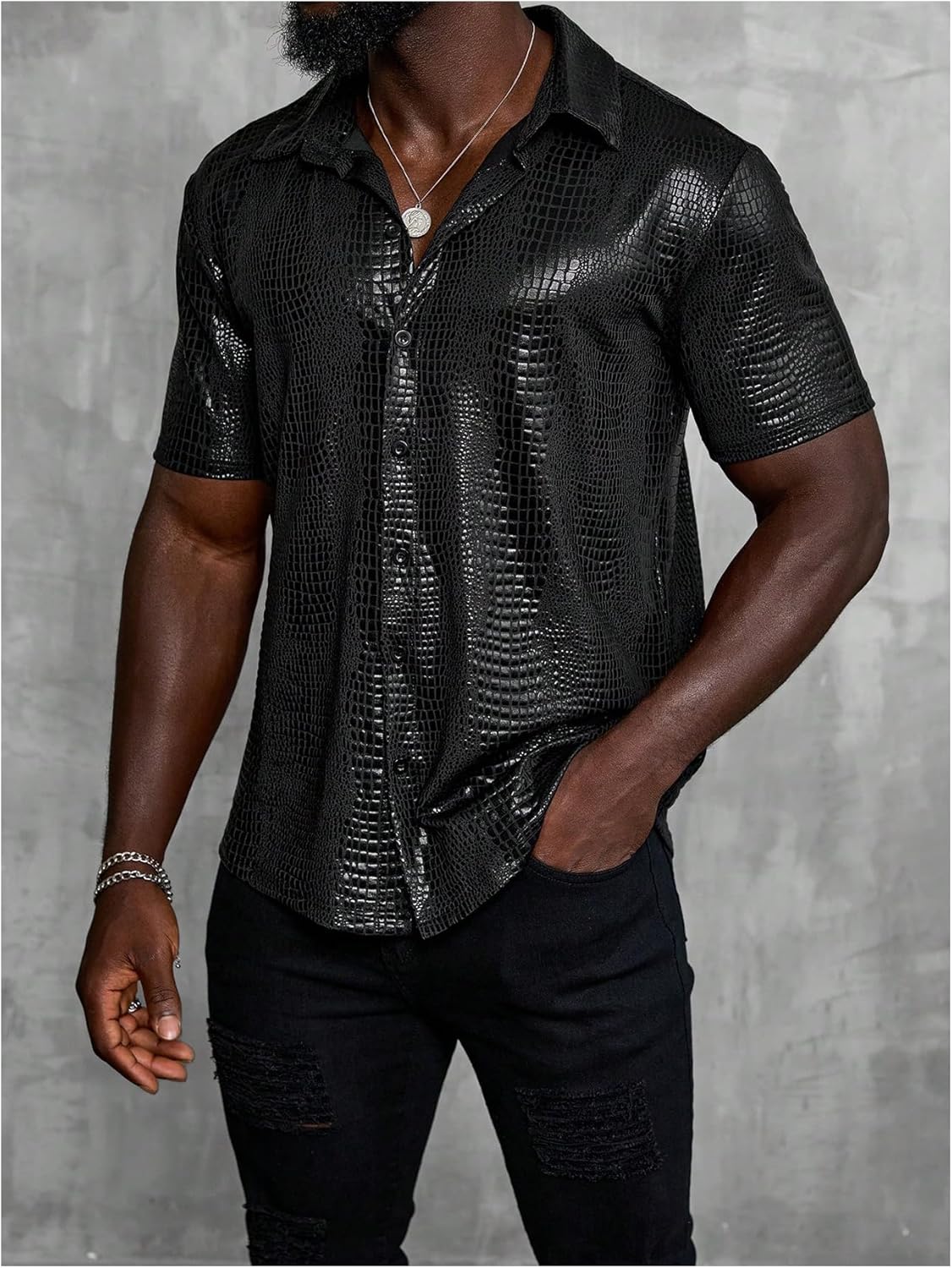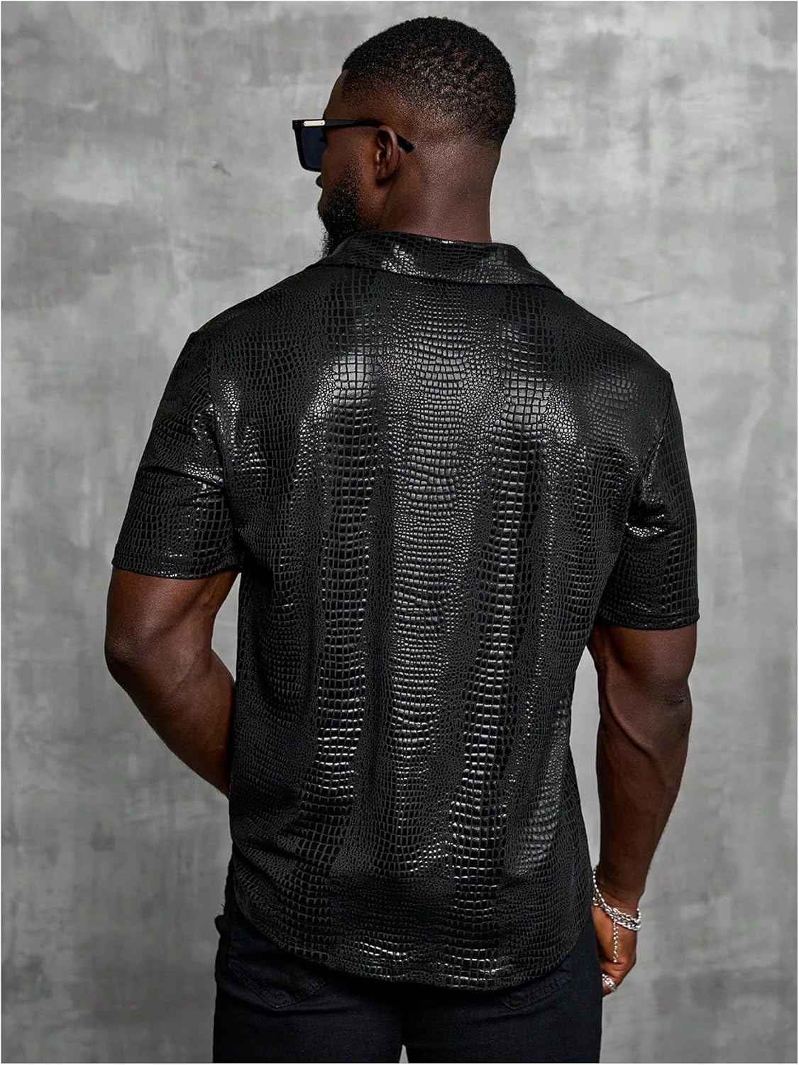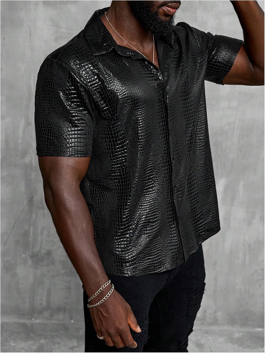 Features: Crocodile print, button front, shirt collar, short sleeves, regular fit.