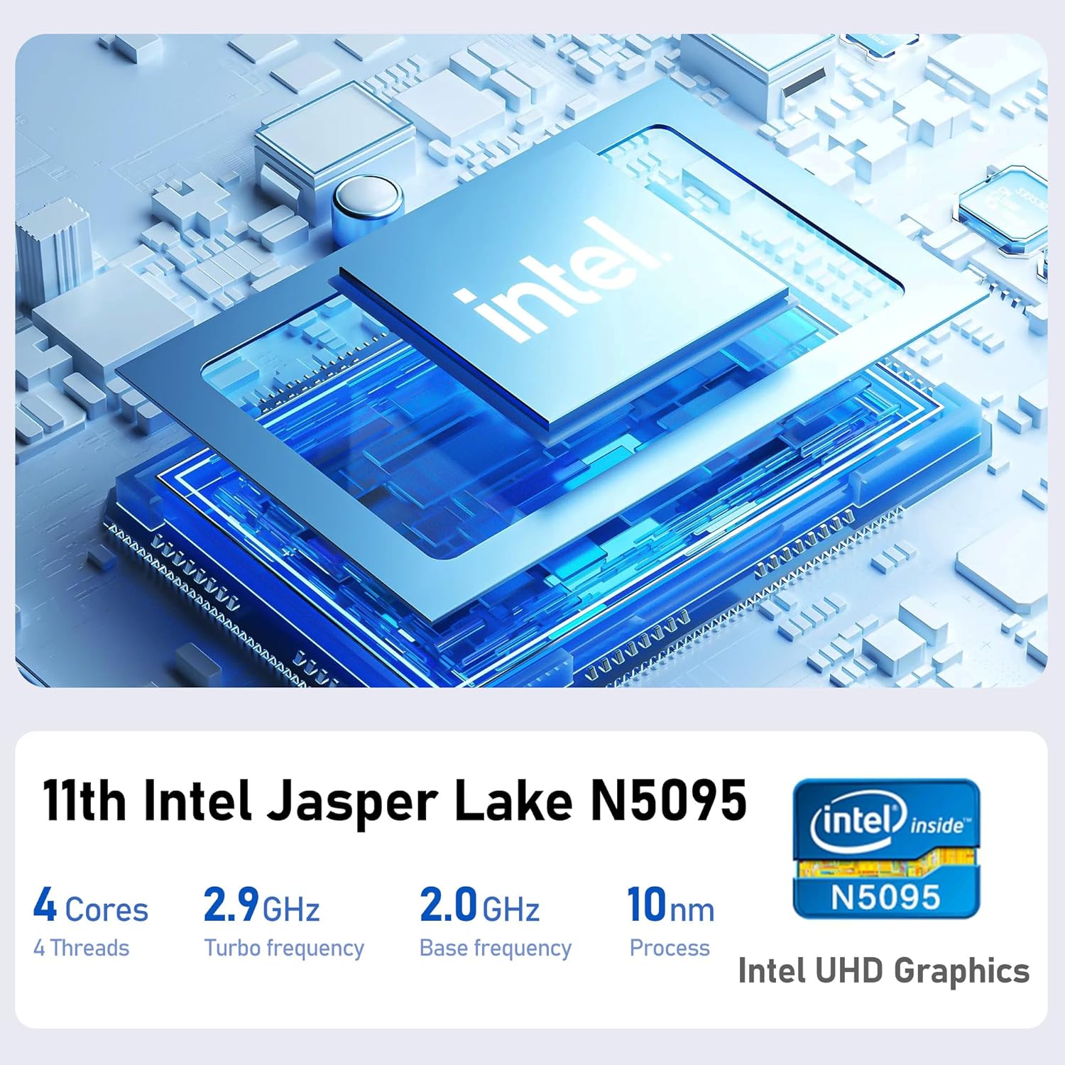 【Processor & Graphics】Powered by an 11th generation Celeron N5095 processor ( 4 cores, 4 threads, L3 Cache: 4 MB, Clockspeed at 450 MHz, Up to 750 MHz at Max Turbo Frequency) and Intel UHD Graphics provide HD video playback and daily work and basic gaming experience for you.