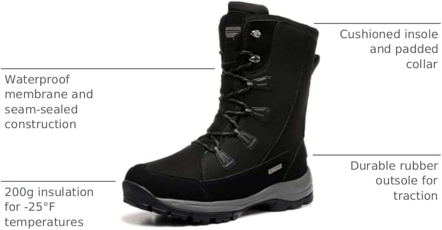 Waterproof: Designed with a waterproof membrane and seam-sealed construction to keep your feet dry in snowy or wet conditions.