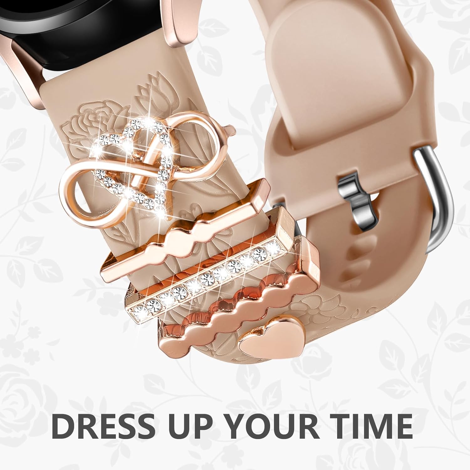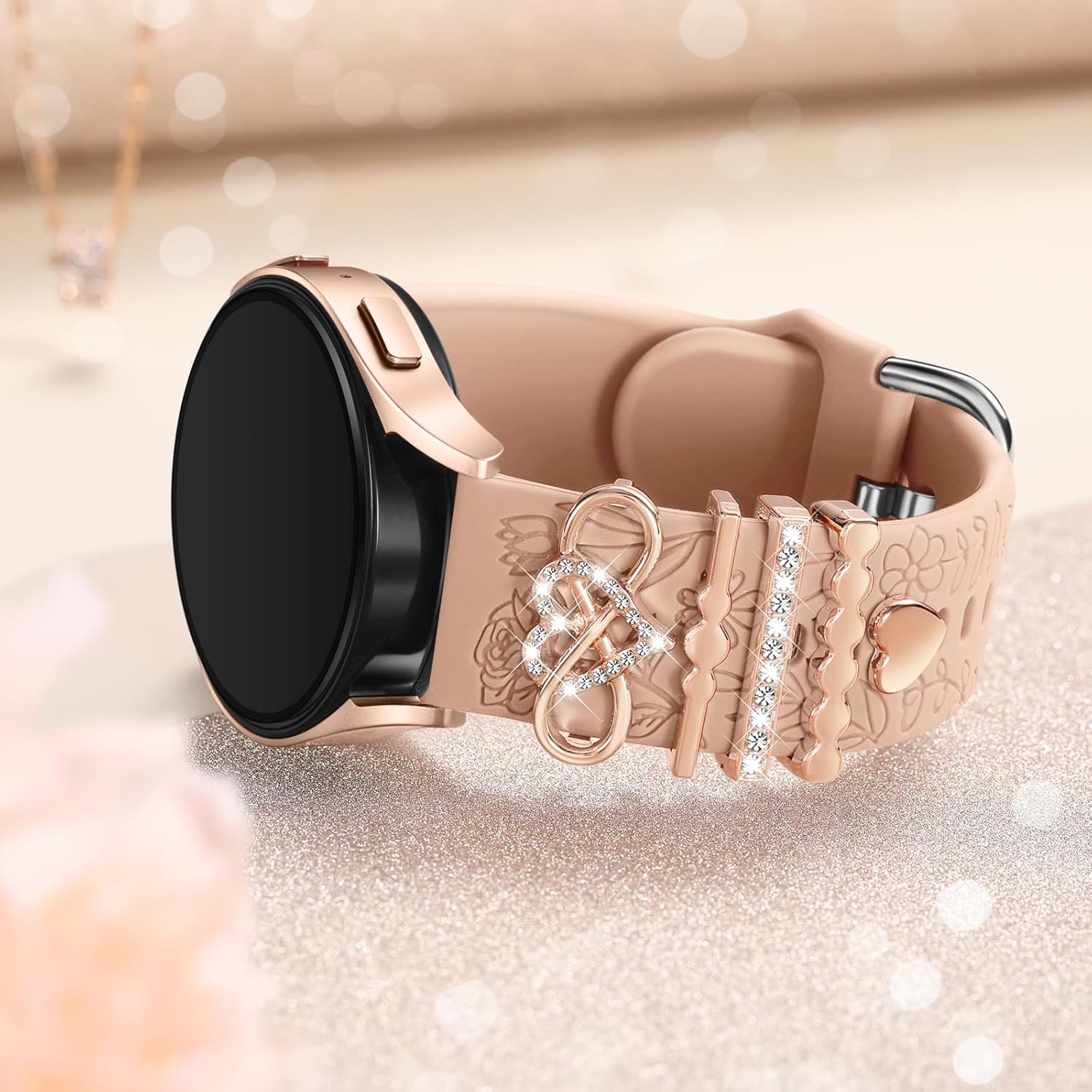 【Elegant Decorative Accessories】DaQin fancy rose engraved bands with charms for samsung galaxy watch 7 band come with sparkling metal decorative rings. Expertly crafted with durable metal plating, these rings offer a personalized touch to your strap while ensuring long-lasting strength. Measuring 20mm in length and 3.5mm in height, they fit most silicone bands, enhancing the look of your watch with stylish flair