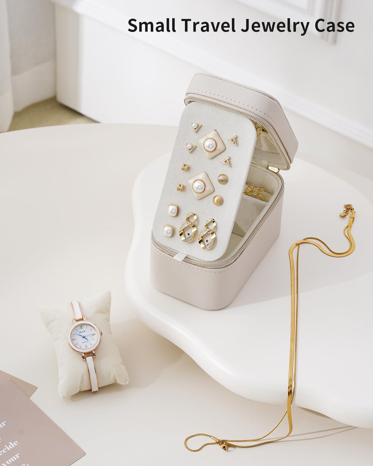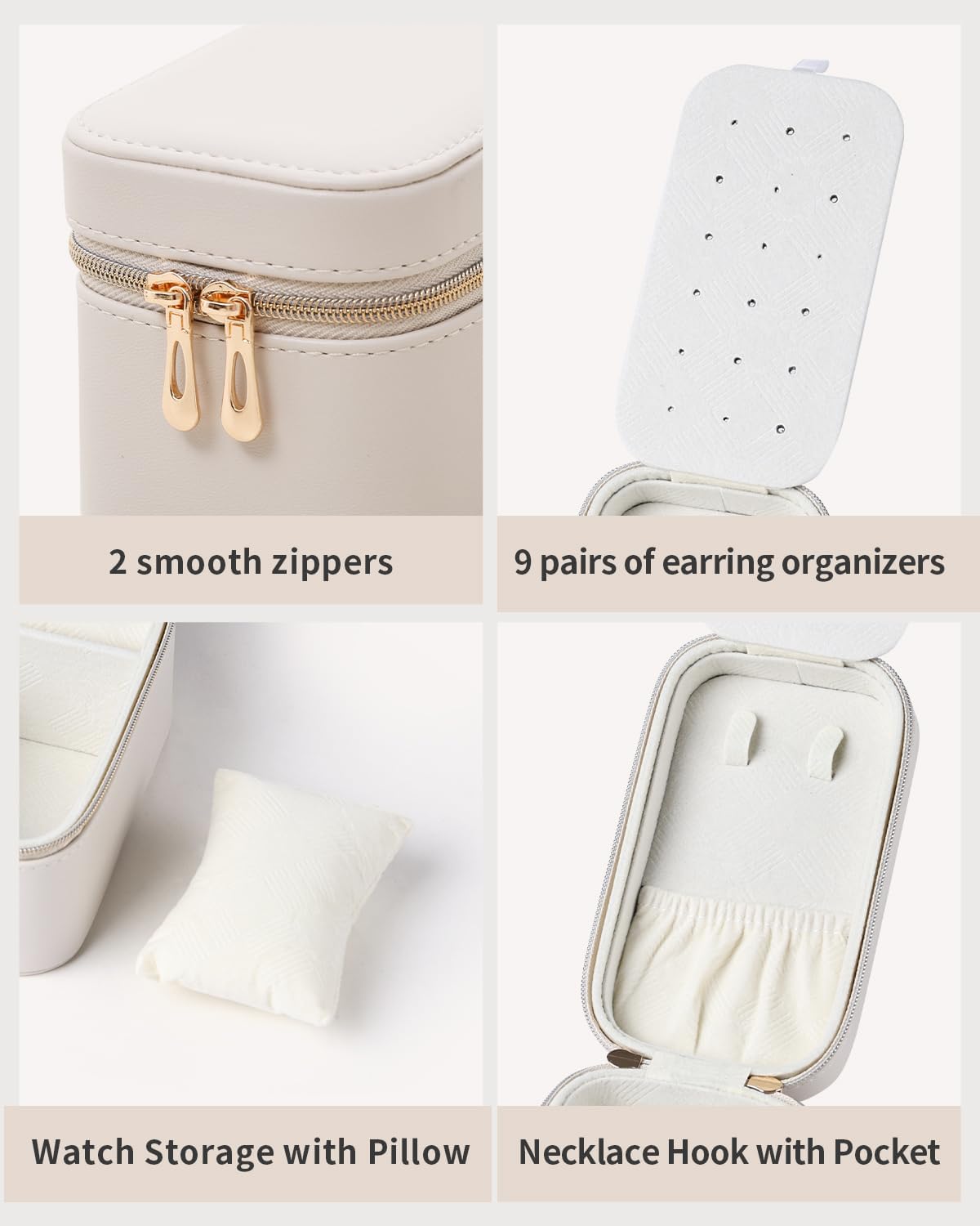 STYLISH WATERPROOF LEATHER: Made of smooth PU synthetic leather outer layer, waterproof and durable Compact and portable Keeps you neat and tidy on the go, holds 3 necklaces, 9 pairs of earrings, 1 pair of rings, and even comes with a watch pillow for bracelets or even a watch, perfect for organizing what you need for your daily ensemble!