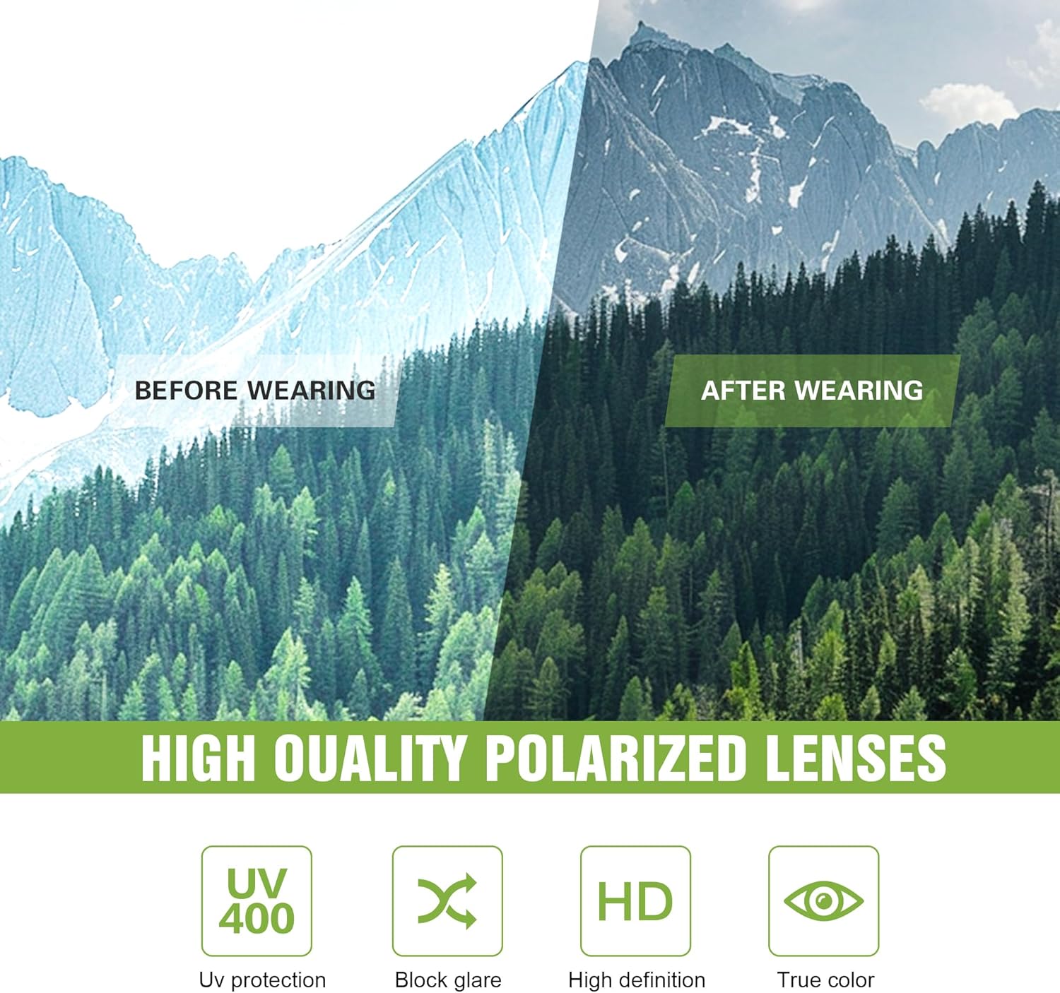 UV Protection and Clear Vision: Utilizing advanced UV400 lens technology, these mens polarized sunglasses effectively block over 99.9% of harmful UV rays, providing comprehensive protection for your eyes. The HD polarized mens fishing running sunglasses lenses reduce glare and reflections, delivering a clear visual experience for any outdoor activity, whether it's fishing or running