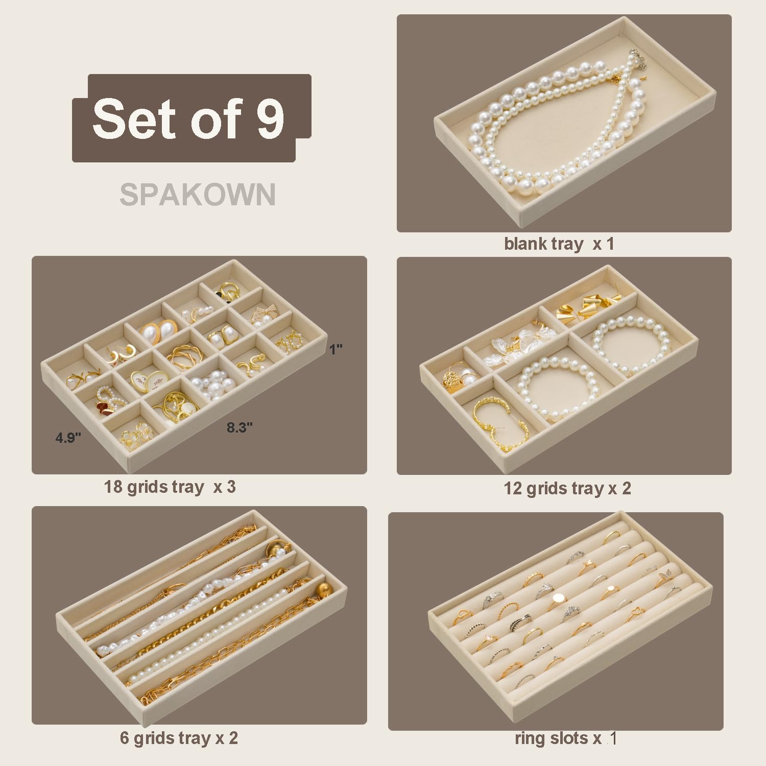 Set of 9: Include 18 grids tray × 3, 6 grids bracelet tray × 2, 6 grids necklace tray × 2, ring tray × 1, blank tray × 1, these trays can perfectly storage your earrings bracelets necklaces rings etc