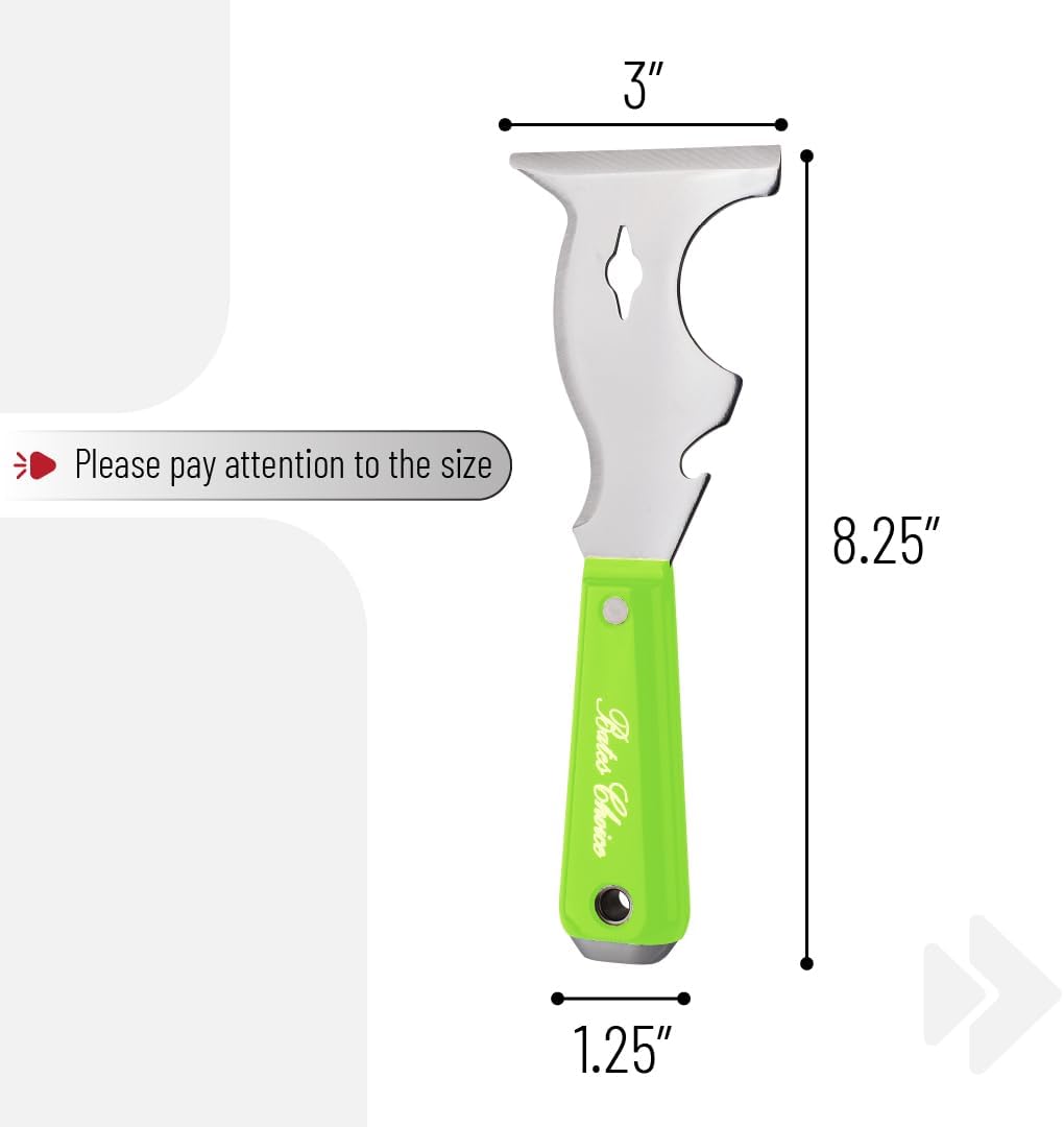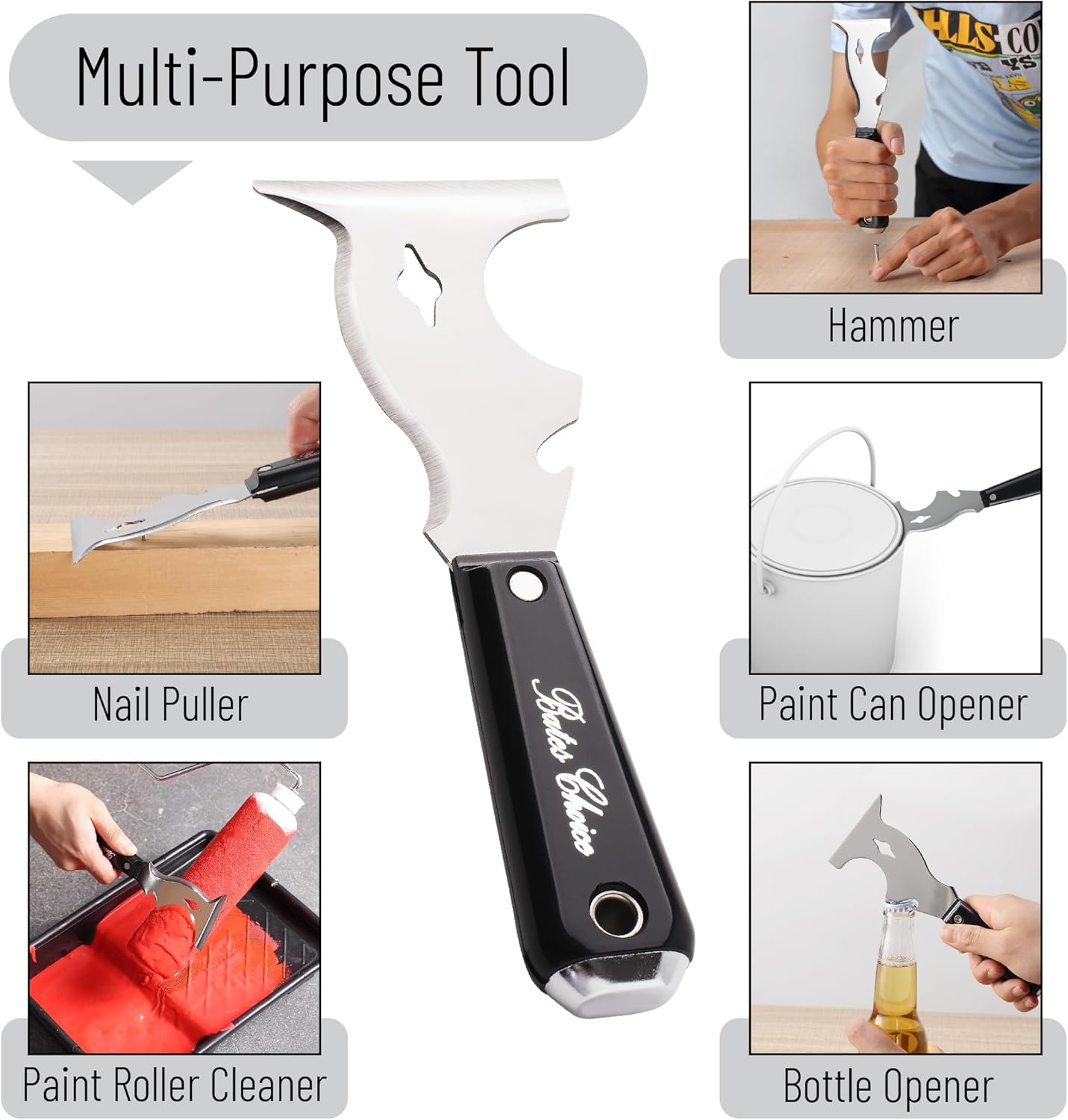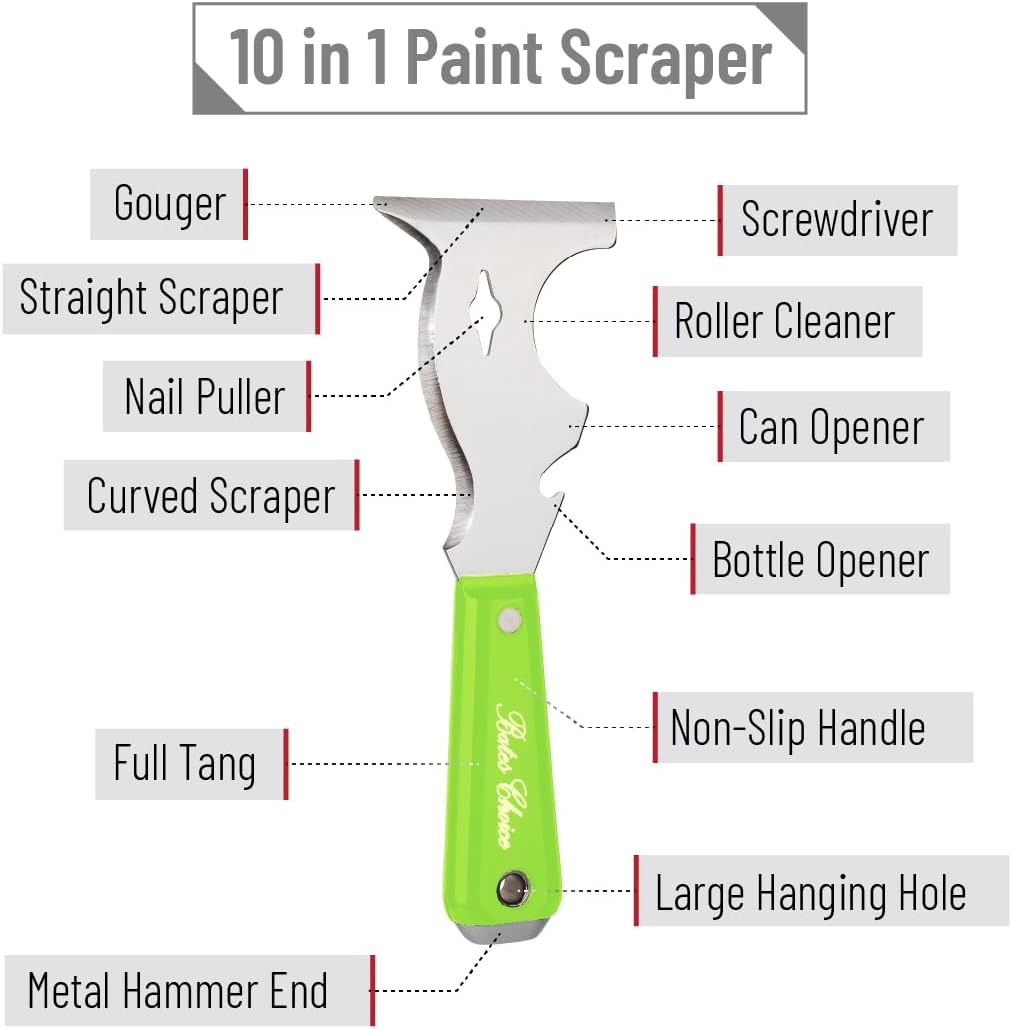 Its 10 functions include a straight scraper, curved scraper, gouger, nail puller, screwdriver, roller cleaner, can opener, bottle opener, metal hammer end, and a hanging hole for easy storage.