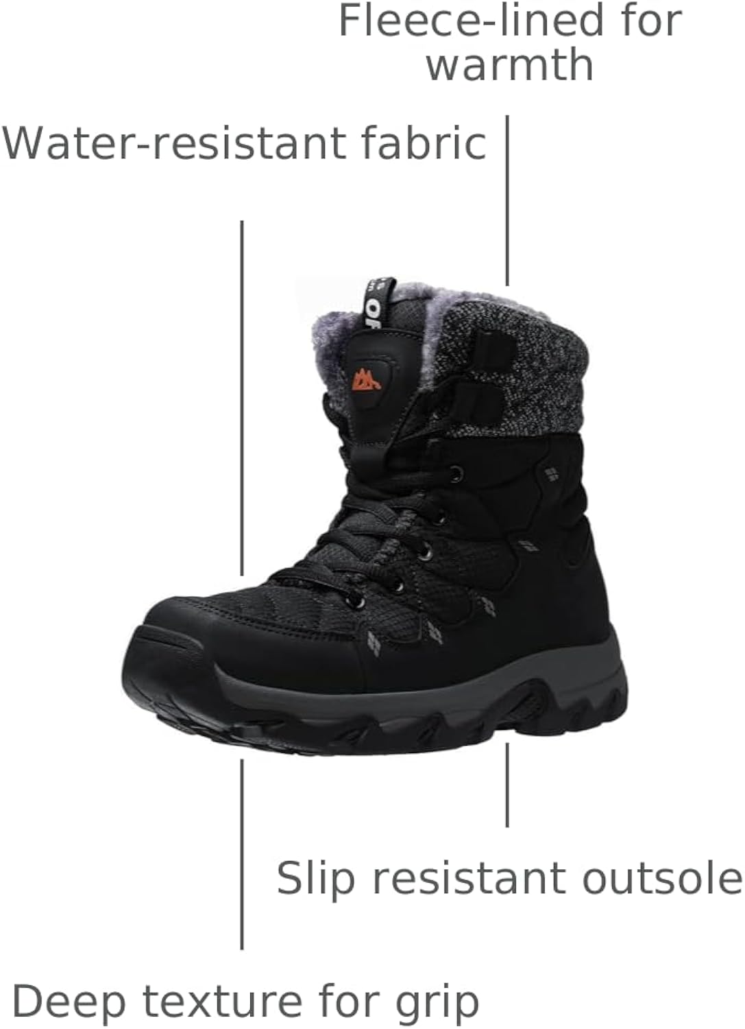 Water Resistant: Utilizing water-resistant fabric, these winter boots effectively repel rain and snow from seeping in. We recommend using a water repellent spray If you spend a long time in snowy conditions.