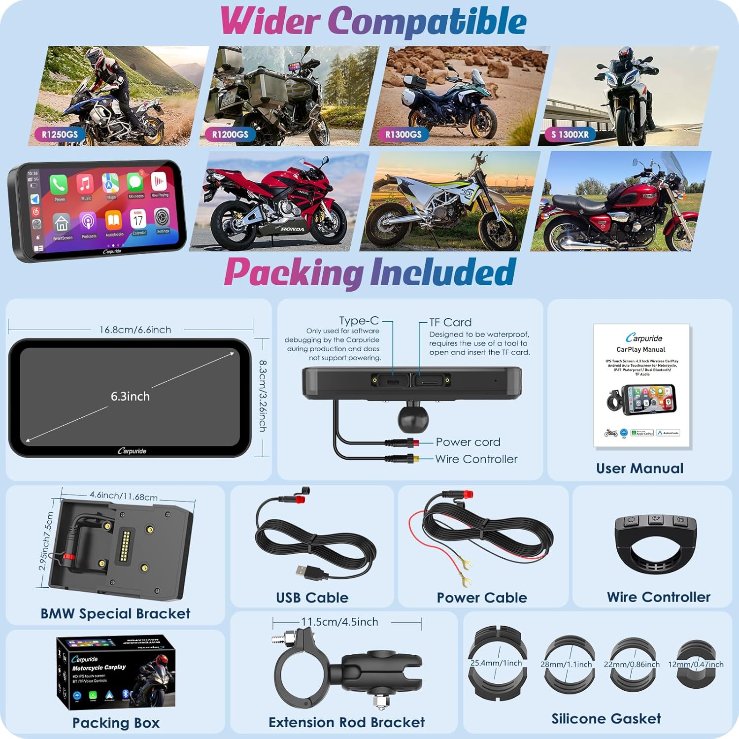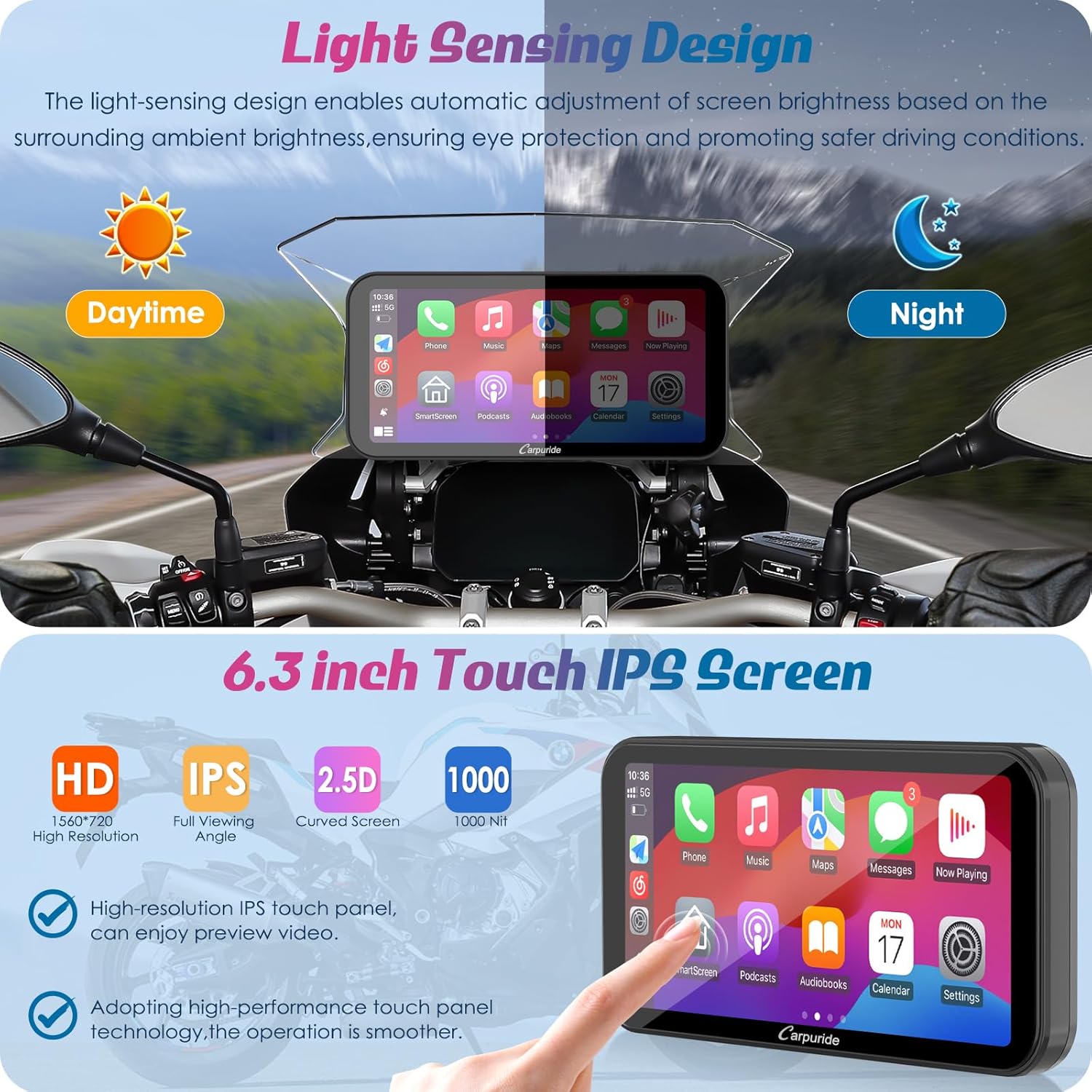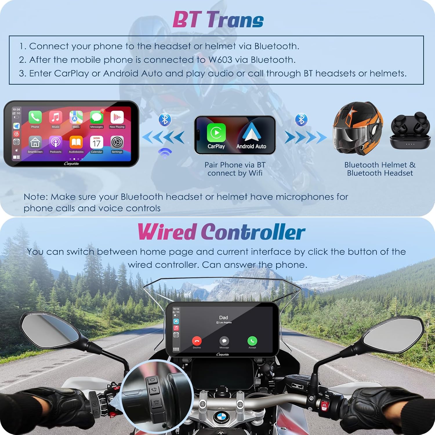 【Wireless CarPlay and Android Auto for BMW Motorcycle】: Carpuride W603b motorcycle carpaly with custom motorcycle mount is designed for BMW Motorbike, Compatible with CarPlay or Android Auto. Allows you to focus on the road and ride safely. By wirelessly connecting your smartphone to your motorcycle's touchscreen via Bluetooth, you can access map navigation, phone calls, music playback, text messaging, and more with the help of Siri or G00gle Assistant.