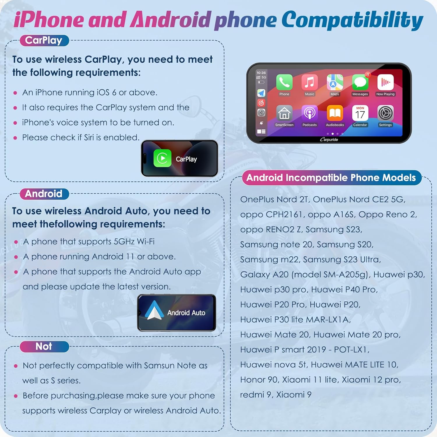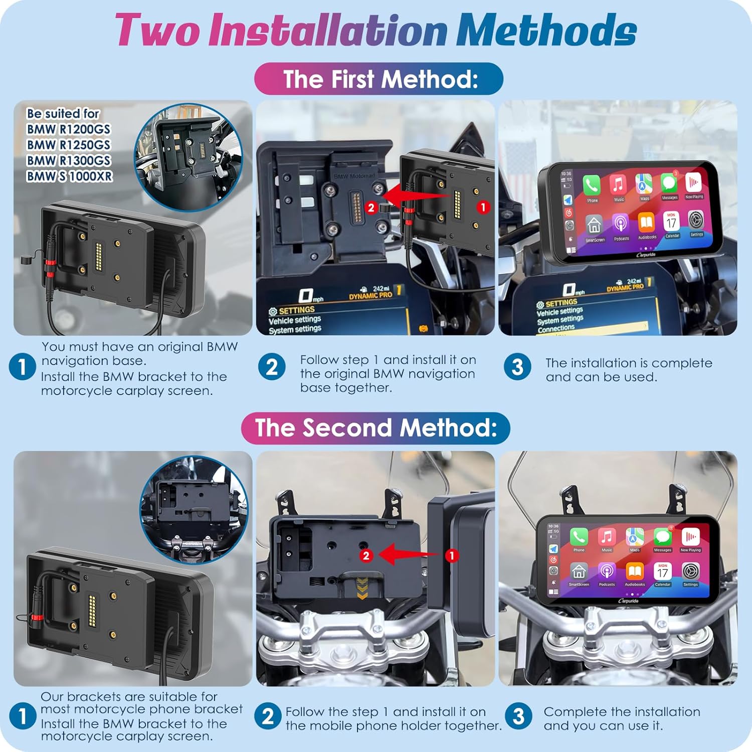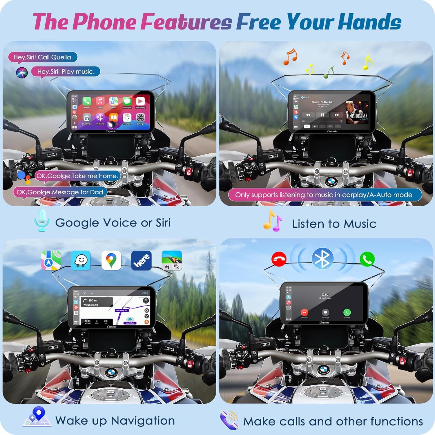 【Wireless CarPlay and Android Auto for BMW Motorcycle】: Carpuride W603b motorcycle carpaly with custom motorcycle mount is designed for BMW Motorbike, Compatible with CarPlay or Android Auto. Allows you to focus on the road and ride safely. By wirelessly connecting your smartphone to your motorcycle's touchscreen via Bluetooth, you can access map navigation, phone calls, music playback, text messaging, and more with the help of Siri or G00gle Assistant.