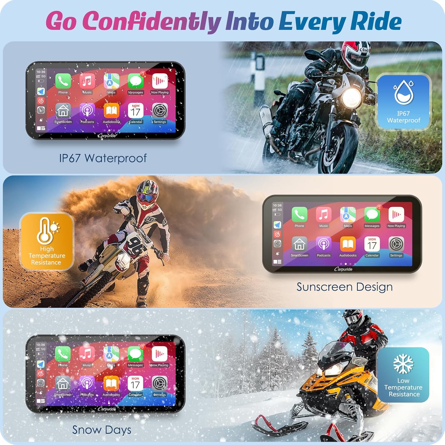 【 Ip 67 Waterproof & Anti-Theft Design】The carpuride 6.3 inch motorcycle GPS has has rugged, Ip 67 waterproof design and thief-proof detachable bracket. No matter the weather conditions, our Ip 67 waterproof motorcycle navigator can handle it all. From heavy rains to scorching sun, its durable design ensures reliable performance. It operates flawlessly in temperatures ranging from -20°C to 80°C.